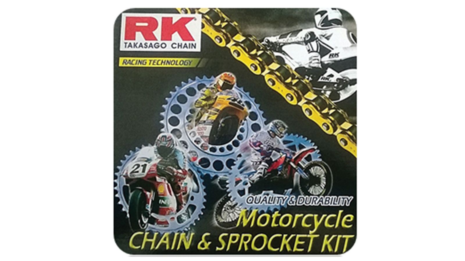 Η αλυσίδα RK χαρίζει υψηλή αντοχή και παρέχει άριστη ποιότητα. Είναι κατάλληλη για όλες τις µοτοσικλέτες. Τώρα µπορείτε να βρείτε διαθέσιµα και κιτ για µοτοσικλέτες και παπιά. Επίσης από την εταιρεία RK µπορείτε να προµηθευτείτε γρανάζια για µοτοσικλέτες µέσα από µια πλήρη γκάµα. Τα χαρακτηριστικά τους: Ειδική επεξεργασία στην επιφάνεια (heat treatment), ενίσχυση στα δόντια και κατασκευή carbon steel S45-48C. Από την Πατµανίδης Α.Ε.