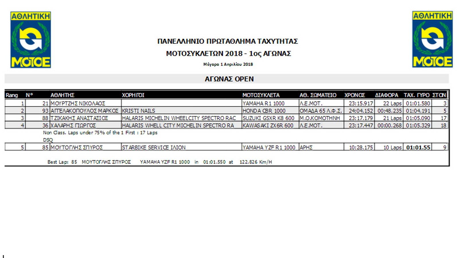 Με μόλις 5 συμμετοχές, η κατηγορία Open δεν παρέλειψε να μας χαρίσει θέαμα, αφού οι Μούρτζης  και Μουτογλης πάλεψαν για την 1η θέση στους πρώτους 10 γύρους, μέχρι τη στιγμή που ο  Μουτογλής είχε πτώση στην 5η στροφή της πίστας. Έτσι η δεύτερη θέση του βάθρου πήγε στον Αγγελακόπουλο που έκανε έναν ήσυχο αγώνα χωρίς να απειληθεί από κανέναν.