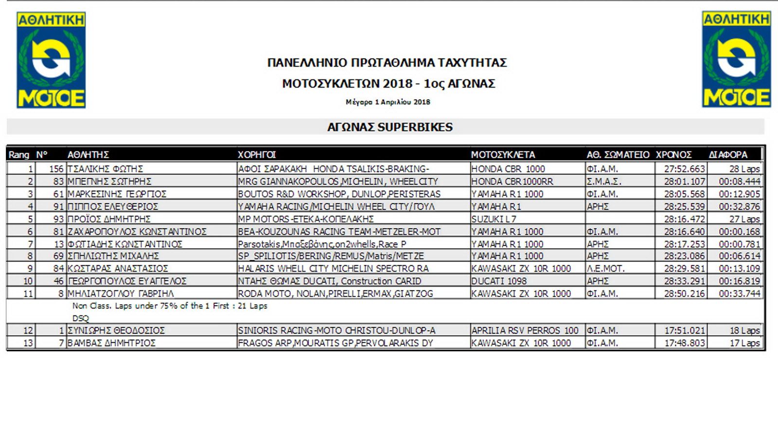 Ο δυνατός αέρας που φυσούσε από το μεσημέρι και μετά στα Μέγαρα, δυσκόλεψε ιδιαίτερα το έργο των 13 αναβατών που ξεκινούσαν στη μεγάλη κατηγορία. Ο Συνιώρης, κάτοχος της Pole Position έστριψε πρώτος με δέυτερο τον Τσαλίκη που έκανε εκπληκτική εκκίνηση από την 5η θέση. Πίσω τους, ακολουθούσε ο Πίππος μαζί με τον Μπεγνή και τον Μαρκεσίνη κάνοντας διαφορά από τους υπόλοιπους 8 αναβάτες.
