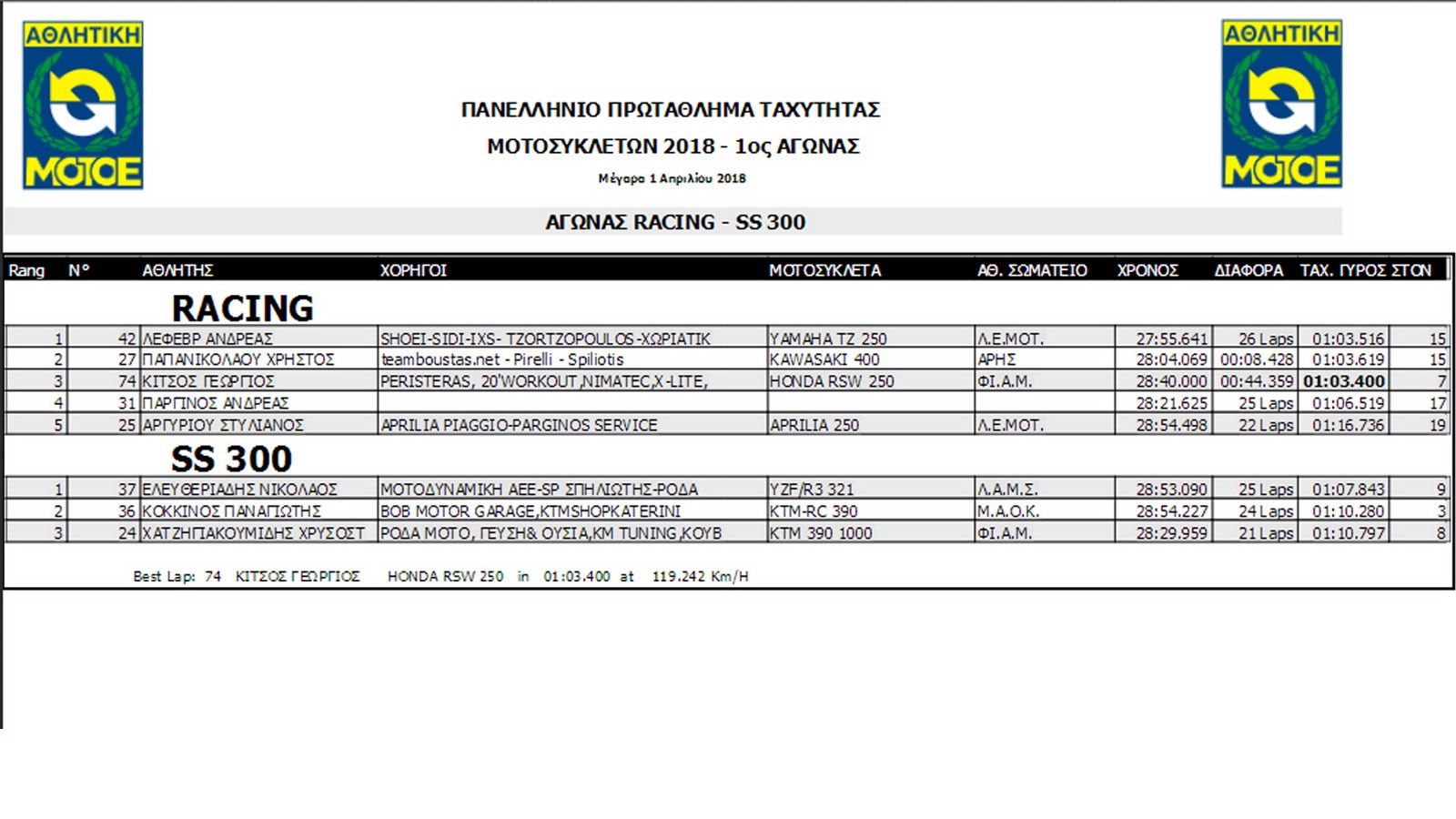 Έτσι στους πρώτους γύρους είχαμε εναλλαγές της πρώτης θέσης μεταξύ τους, με τον Κίτσο να ακολουθεί. Τελικά ο Λεφεβρ κατάφερε να ξεφύγει και να πάρει τη νίκη με τον Παπανικολάου 8 δευτερόλεπτα πίσω του και τον Κίτσο στην 3η  θέση μπροστά από Παργινό και  Ελευθεριάδη που τερμάτισε πρώτος για τα SS300.
