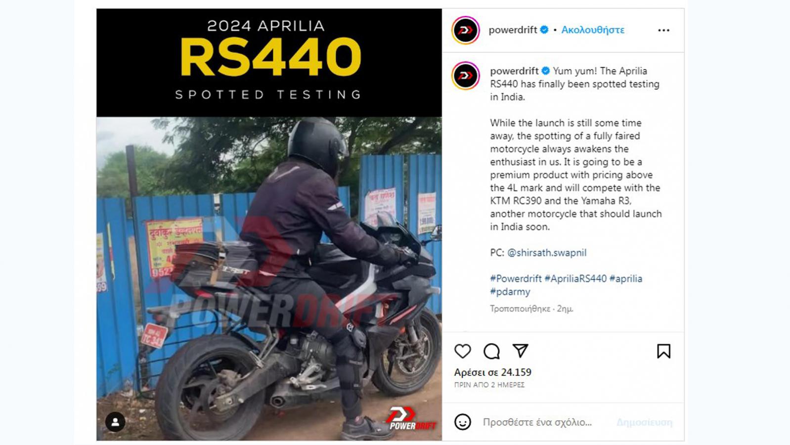 Αν ισχύει η πληροφορία ότι το Aprilia RS 440 θα παρουσιαστεί επίσημα κοντά στις ημερομηνίες διεξαγωγής του ινδικού MotoGP που θα γίνει το Σεπτέμβρη, τότε η μοτοσυκλέτα είναι μόλις ένα βήμα πριν την παραγωγή. Βέβαια όλα τα παραπάνω είναι μέχρι στιγμής εικασίες, αφού η ιταλική εταιρεία κρατάει κλειστά τα χαρτιά της και το μόνο που έχουμε να κάνουμε είναι να περιμένουμε μέχρι τις 22 Σεπτεμβρίου!