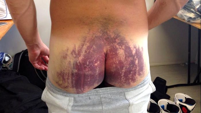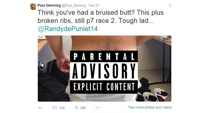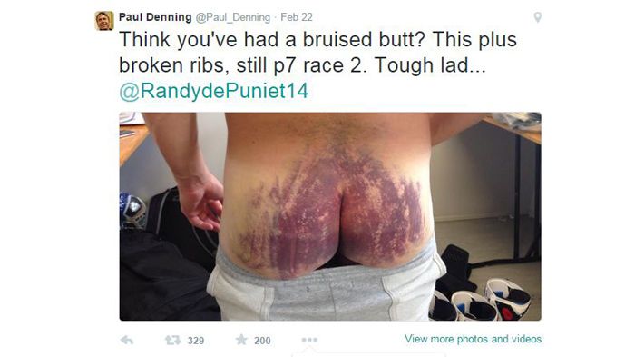 Η πρόθεσή του πάντως ήταν καλή, όπως αποκαλύπτει το σχόλιο που τη συνοδεύει: «Νομίζετε πως έχετε μελανιάσει τον πισινό σας; Πάρτε αυτό, συν σπασμένα πλευρά, και παρόλα αυτά 7η θέση στο 2ο σκέλος. Σκληρό παλικάρι...» Ναι, όντως είναι.