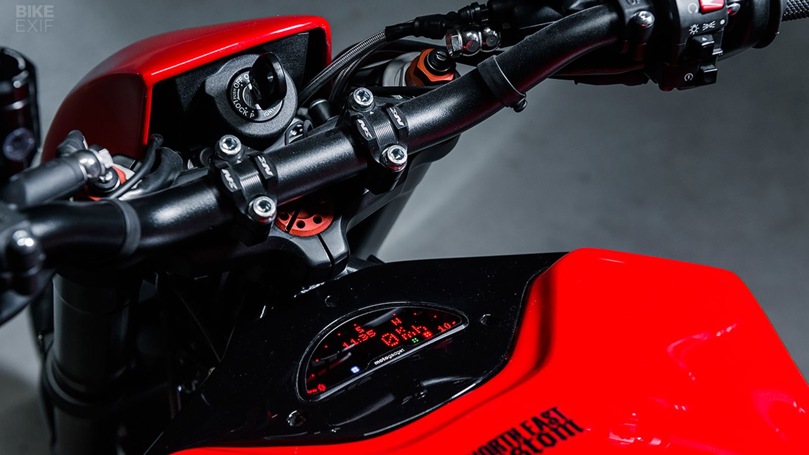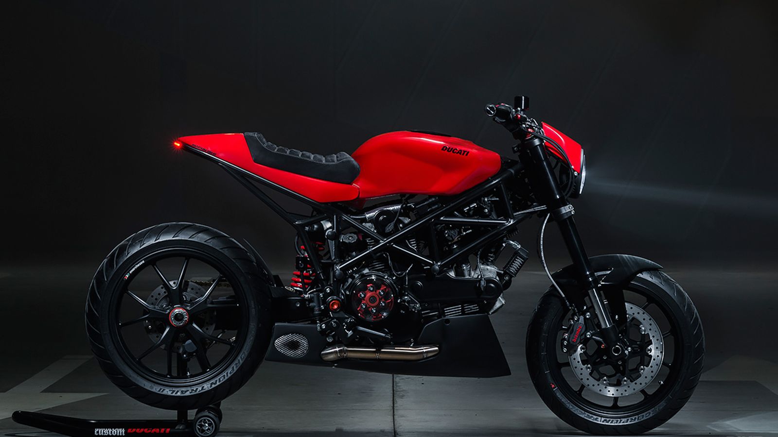 Η μοτοσυκλέτα αποτελεί μια δημιουργία των North East Customs από την Ιταλία, που μεταμόρφωσε ριζικά την Multistrada κάνοντας την κάτι σαν… Monster! Ουσιαστικά, το μόνο που έμεινε ίδιο με το βασικό μοντέλο ήταν οι αναρτήσεις και η βασική γεωμετρία, καθώς η βασική μορφή της Multistrada απλά… δεν υπάρχει πλέον. Η ουρά είναι χειροποίητη σε ένα ενιαίο κομμάτι ατσαλιού, ενώ το ρεζερβουάρ προήλθε από μια 999. Νέο είναι το υποπλαίσιο, χειροποίητο από ατσάλι, με την σέλα και το πίσω φωτιστικό LED να είναι επίσης καινούργια για την περίσταση.