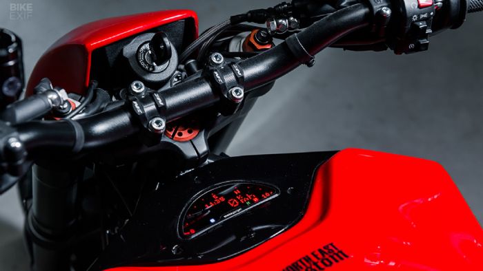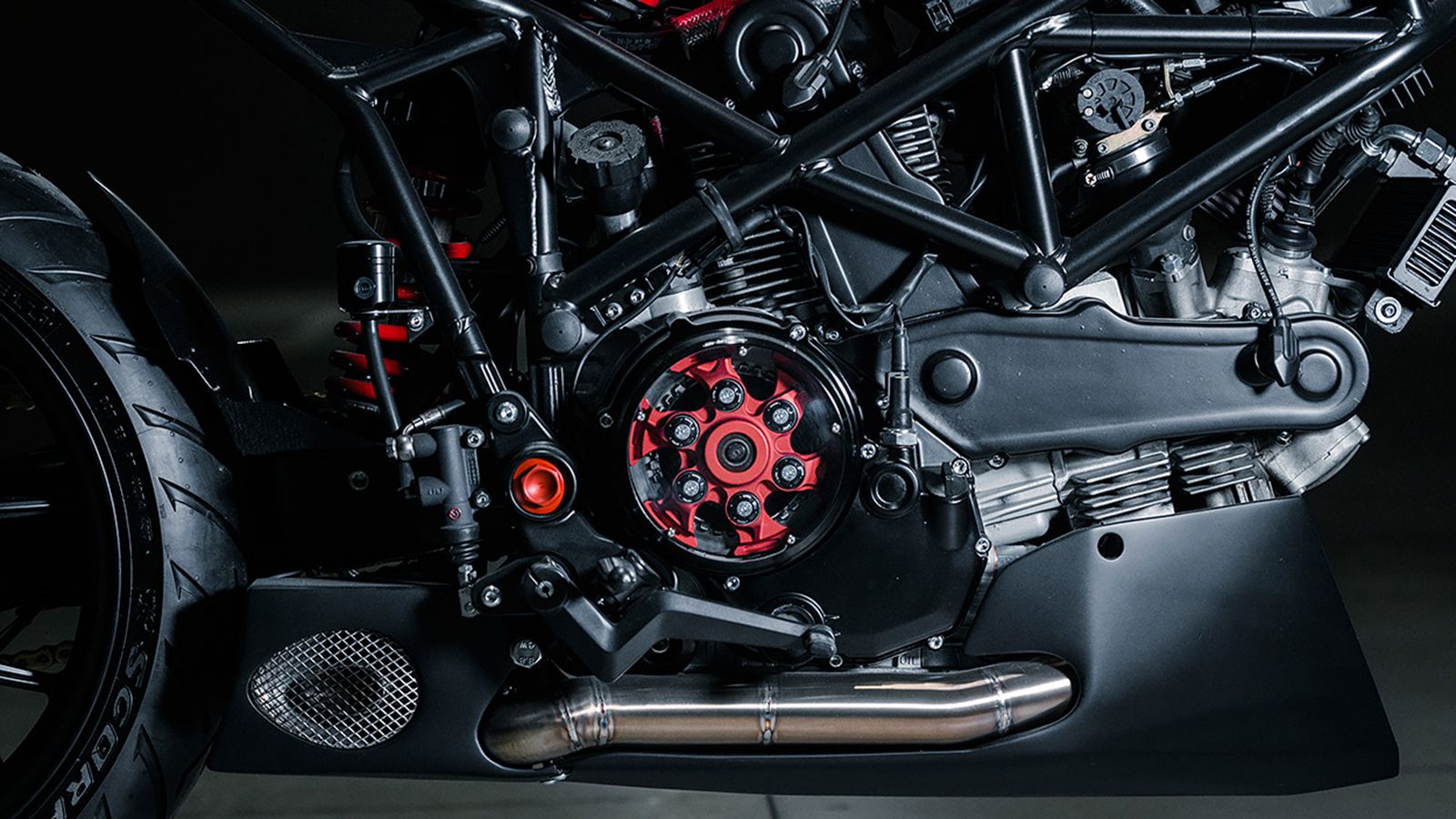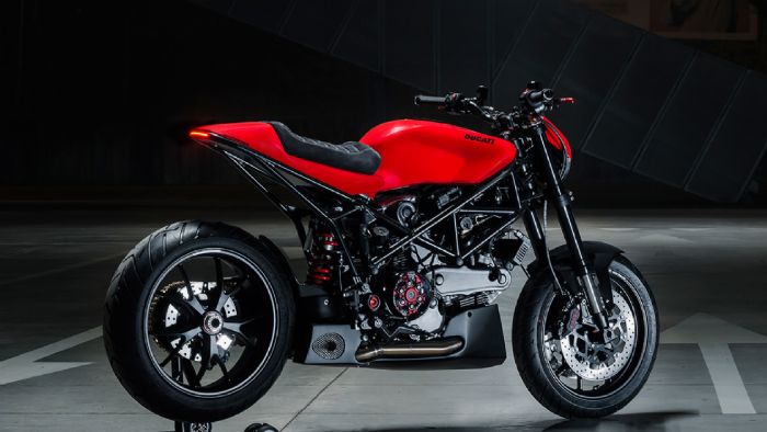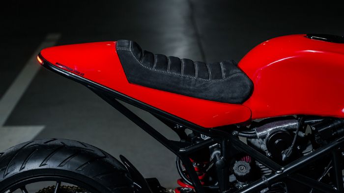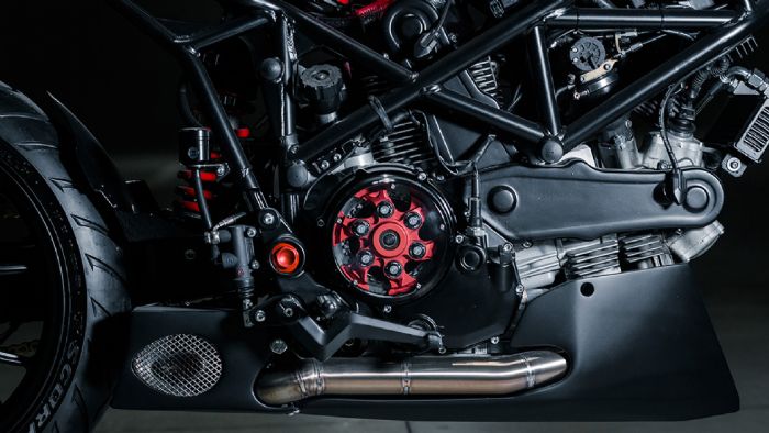 Οι τροχοί του μοντέλου προέρχονται από ένα Hypermotard,όπως επίσης και τα εμπρός φρένα, ενώ το εμπρός φωτιστικό σώμα είναι LED, της Koso και βρίσκεται μέσα σε ένα χειροποίητο μασκάκι. Στην θέση οδήγησης, το τιμόνι και τα καβαλέτα του είναι νέα, όπως επίσης και τα φλας, οι μανέτες και το δοχείο υγρών εμπρός φρένου. Στο κάτω μέρος της μοτοσυκλέτας, η νέα εξάτμιση κρύβεται επιμελώς από μια χειροποίητη καρίνα, θυμίζοντας τα μοντέρνα Ducati μοντέλα. Πως σας φαίνεται;