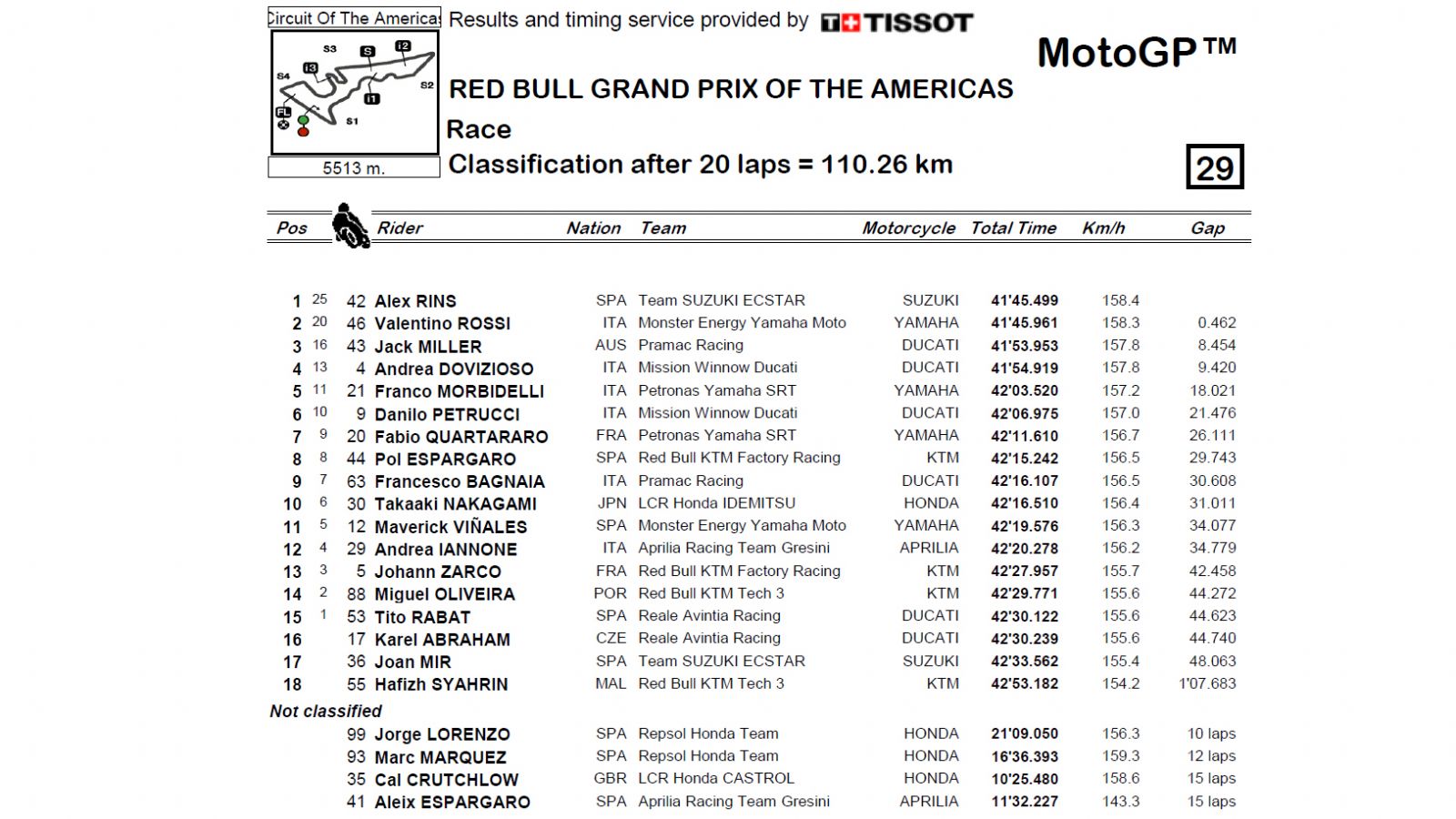 Ο Rins οδήγησε ψύχραιμα χωρίς να υποπέσει σε λάθη στην πίεση των τελευταίων γύρων, ενώ αντιθέτως ο Valentino έκανε δύο που τον απομάκρυναν 0,7 sec. από τον νεαρό διεκδικητή. Εκεί χάθηκε ο αγώνας για τον Valentino, χωρίς βεβαίως αυτό να μειώνει την απίστευτη θέλησή του για νίκη και τη μοναδική του ικανότητα να παλεύει έως τη γραμμή του τερματισμού…