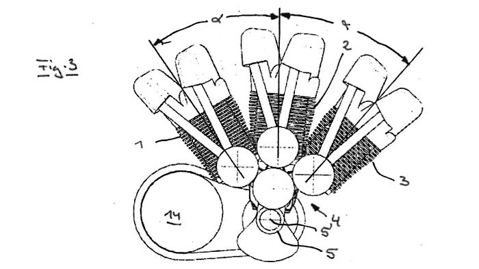 Δηλαδή, όπως φαίνεται και στα σχέδια, πρόκειται για έναν τρικύλινδρο σε σειρά με τον στρόφαλο εγκάρσια στο πλαίσιο, αλλά με τους κυλίνδρους σε διαφορετικές γωνίες, σχηματίζοντας οπτικά από το πλάι το γράμμα W. Οι γωνίες αυτές δεν καθορίζονται, αλλά η πατέντα αφορά το γενικότερο σχέδιο με οποιεσδήποτε περιεχόμενες γωνίες.