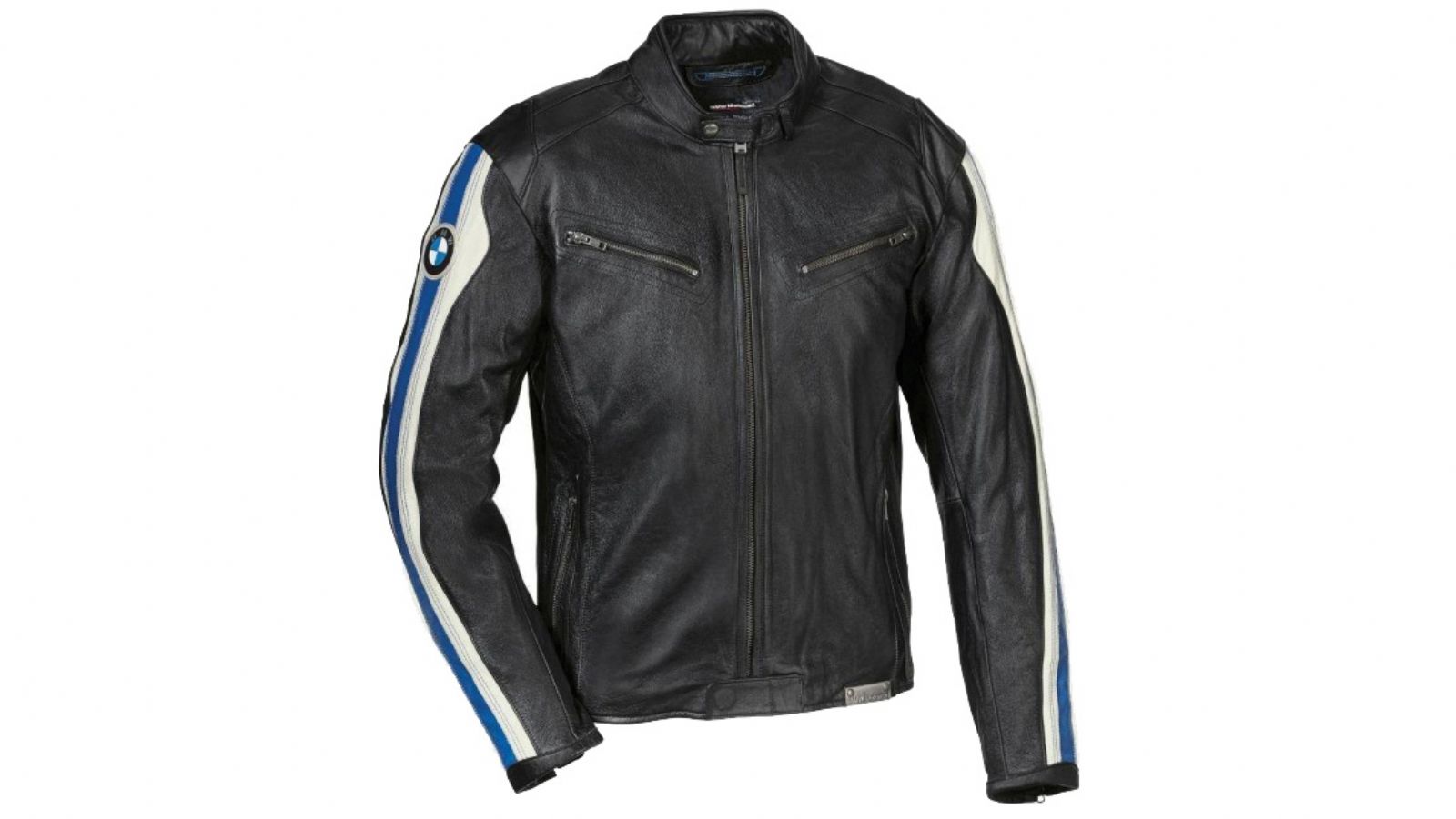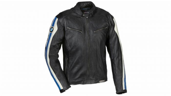 Έχει όρθιο γιακάς ειδικής επεξεργασίας, κούµπωµα µε σούστα, µπλε ή κόκκινη λωρίδα δέρµατος µε διακοσµητικές πλευρικές πισωραφές στο µανίκι, που τονίζει τη σιλουέτα. Διαθέτει µεταλλικό φερµουάρ µπροστά σε ολόκληρο το ύψος, µε προστατευτική λωρίδα στην κάτω πλευρά, για να µη µαγκώνει. Έχει 4 εξωτερικές τσέπες µε φερµουάρ, 2 εσωτερικές τσέπες µε φερµουάρ.