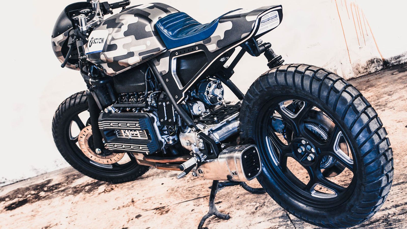 Το μοντέλο φορά ένα τεπόζιτο καυσίμου από το μικρότερο Κ75, κάτι που ώθησε τον Mulak να χρησιμοποιήσει την απόχρωση καμουφλάζ που βλέπετε. Ο λόγος; Στον Mulak δεν αρέσει καθόλου το σχήμα του ρεζερβουάρ του Κ75! Αυτό που επίσης μισούσε ο Πολωνός στην μοτοσυκλέτα ήταν το υποπλαίσιο, το οποίο αντικατέστησε με νέο και το έκρυψε κάτω από μια περίτεχνη αλουμινένια κατασκευή. Νέα είναι και η σέλα, η ουρά και το μασκάκι στο μούτρο.