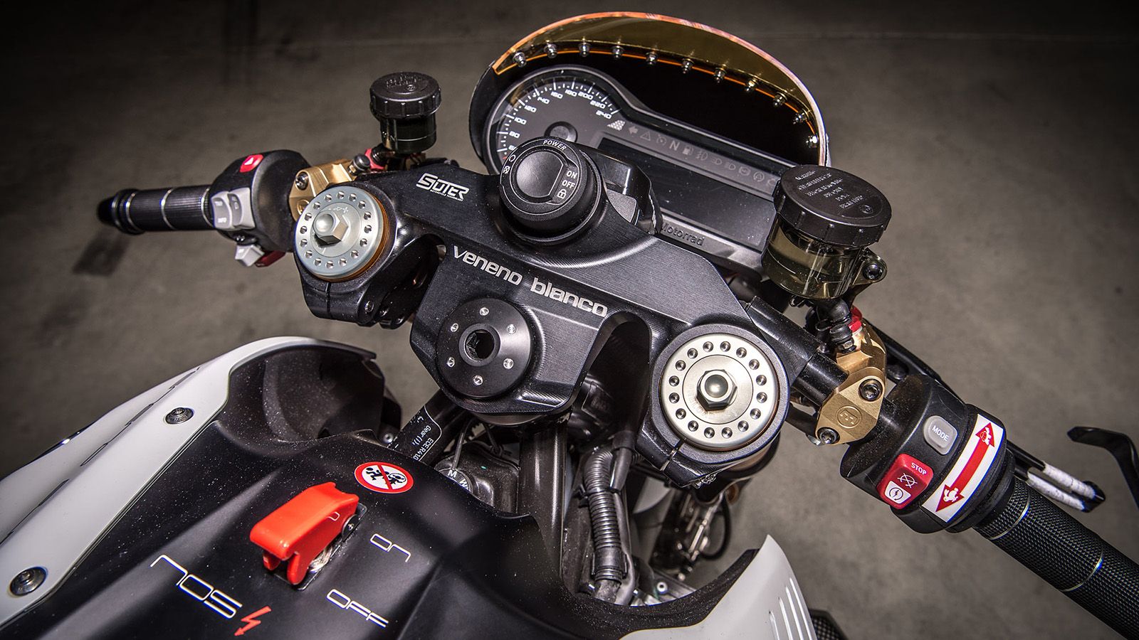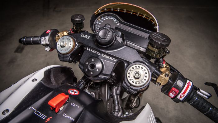 Κατά τα άλλα, η μοτοσυκλέτα έχει, όπως βλέπετε, τόνους πανάκριβων και κορυφαίων περιφερειακών: Πιρούνι Ohlins FGR και αμορτισέρ από την ίδια εταιρεία, φρένα Brembo, νέους τροχούς και μία εντελώς custom «ενδυμασία». Το αποτέλεσμα είναι τουλάχιστον εντυπωσιακό.