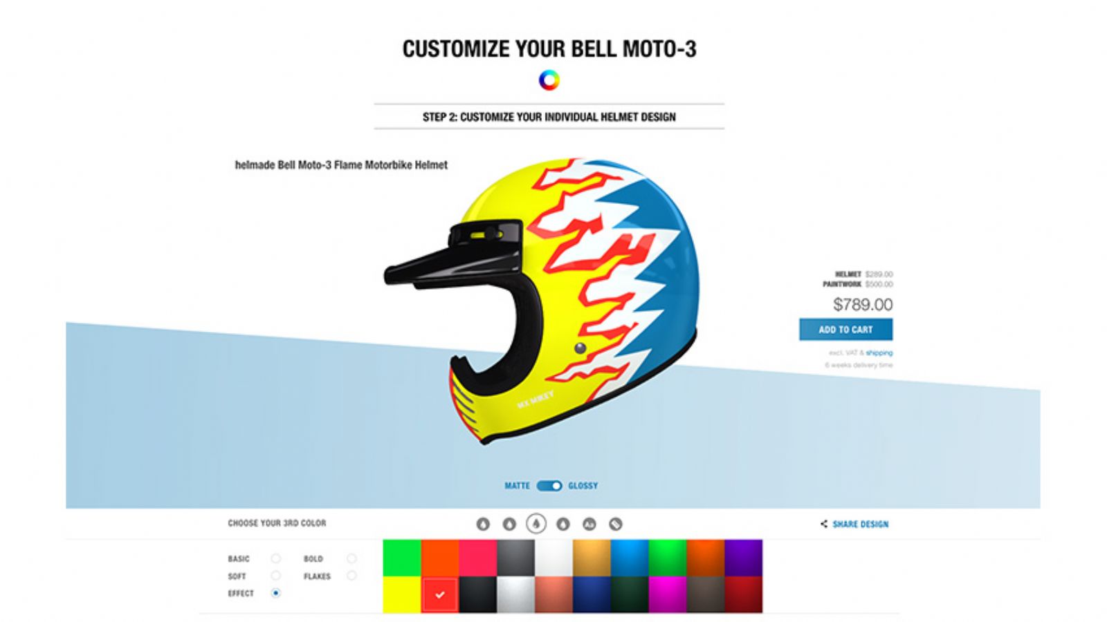 Για να το πετύχει αυτό συνεργάστηκε με την Helmade, η οποία κατασκευάζει custom κράνη και έχει έδρα στη Γερμανία. Για να δημιουργήσεις το δικό σου κράνος το μόνο που έχεις να κάνεις είναι να επισκεφτείς το www.bellhelmets.com και μέσα από την ειδική πλατφόρμα να επιλέξεις μέσα από μια μεγάλη ποικιλία τα σχέδια και τα χρώματα που θέλεις. Προς το παρόν η συγκεκριμένη υπηρεσία είναι διαθέσιμη για τα κράνη Bullit, Custom 500, Moto-3 και Star MIPS.
