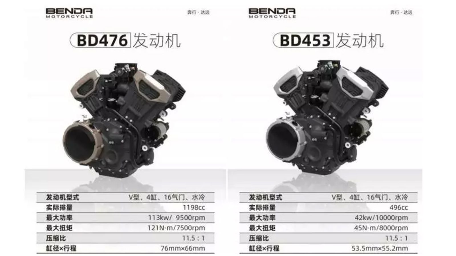 Πιο συγκεκριμένα, στις διεθνείς πηγές ενημέρωσης εμφανίστηκε η είδηση, ότι η κινεζική εταιρεία Benda παρουσίασε δύο νέους V4 κινητήρες. Ο «μεγάλος» από αυτούς, έχει κυβισμό 1.198 κ.εκ, ξεπερνώντας έτσι τους αντίστοιχους V4 της Aprilia και της Ducati (με κυβισμό 1.099 και 1.103 κ.εκ. αντίστοιχα). Αφού λοιπόν το θρυλικό Yamaha V-Max δεν είναι πλέον στην παραγωγή, τότε η Benda παρουσίασε, ούτε λίγο ούτε πολύ, τον μεγαλύτερο V4 του κόσμου. Ο οποίος, δε, έχει διόλου ευκαταφρόνητη απόδοση: Η ισχύς του φτάνει τους 154 ίππους και τα 12,3 kgm ροπής, στις 9.500 και 7.500 στροφές αντίστοιχα.