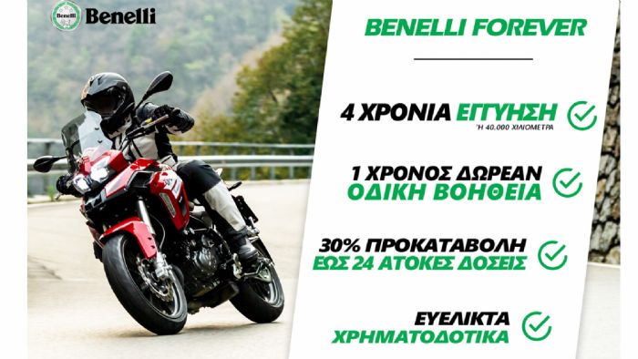 Πιο αναλυτικά, μέσω του προγράμματος Benelli Forever και για την αγορά οποιουδήποτε μοντέλου Benelli από 1/6 έως και 31/12/2020, παρέχονται: • 4 Χρόνια Εγγύηση • 1 Χρόνος Δωρεάν Οδική Βοήθεια