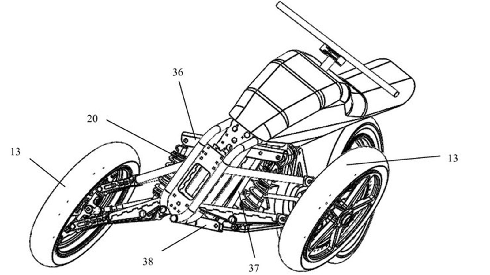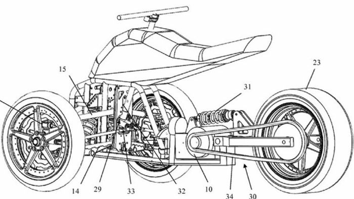 Συγκεκριμένα, στην πατέντα, εμφανίζεται ότι μόνο το εμπρός μέρος του οχήματος γέρνει στις στροφές, καθώς το πίσω θα παραμένει κατακόρυφο. Στην μέση του οχήματος, μπορείτε να δείτε την ειδική άρθρωση που θα το επιτρέπει αυτό, ενώ στον πίσω τροχό διακρίνεται ξεκάθαρα ένα ελαστικό με επίπεδο πέλμα, σαν αυτοκινήτου. Φανερώνει έτσι, φυσικά, ότι το πίσω μέρος το οχήματος θα παραμένει «όρθιο»