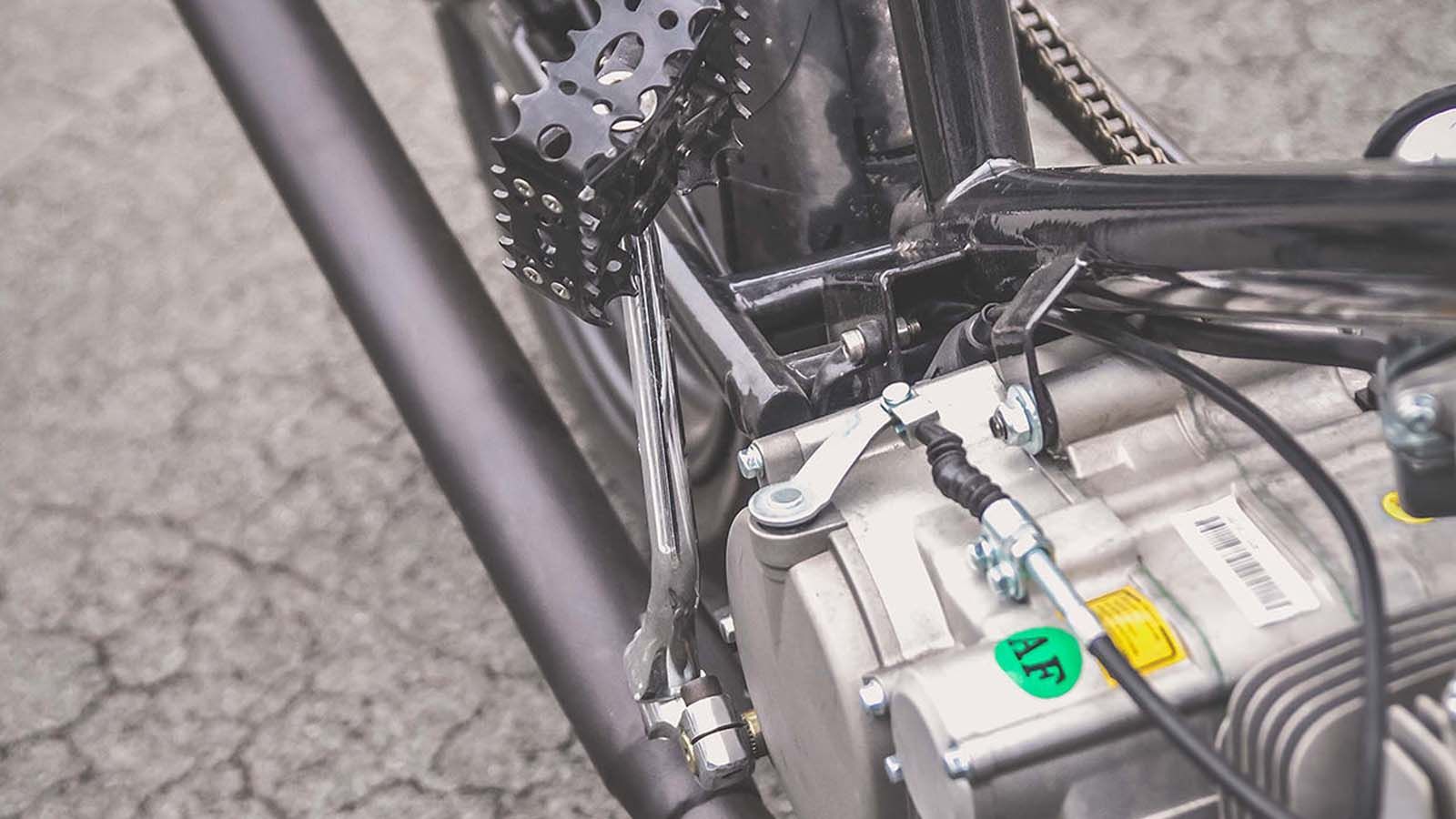 Για την κίνηση του υπέροχου αυτού δίκυκλου, ο Dun επέλεξε έναν κινητήρα 150 κυβικών από Pit bike, με χειροκίνητο σασμάν, το οποίο εξόπλισε με καρμπυρατέρ Mikuni 28 χιλιοστών, διαφορετική σχέση μετάδοσης και custom εξάτμιση. Οι τροχοί είναι μασιφ ατσάλινοι, «ντύνονται» με ελαστικά Michelin Supermoto, ενώ η όλη κατασκευή δεν ξεπερνά τα 66 κιλά. Λεπτομέρειες που κάνουν την διαφορά, η μανιβέλα εκκίνησης που φέρει πεντάλ από ποδήλατο, αλλα και η φιλοξενία του ρεζερβουάρ καυσίμου στον άνω σωλήνα του πλαισίου.