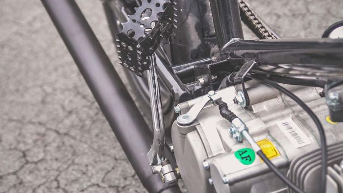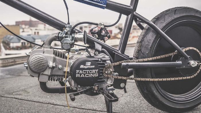 Δείτε τι έχει κάνει εδώ… Αρχικά, ο Dun έπρεπε να εξασφαλίσει το πλαίσιο για την κατασκευή του και αυτό το έκανε, συγκολλώντας ένα πλαίσιο από ένα Super Cub με το πάνω μέρος από το πλαίσιο ενός Mountain Bike, προκειμένου να πάρει την χαρακτηριστική μορφή των BMX. Στο πίσω μέρος, δεν υπάρχει ανάρτηση και το «ψαλίδι» είναι σταθερό, κολλημένο στο πλαίσιο, ενώ προέρχεται επίσης από ποδήλατο.