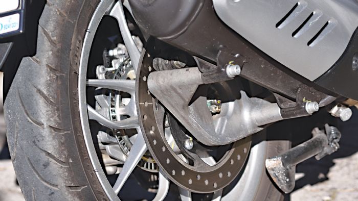 Την πέδηση αναλαμβάνουν μονός δίσκος διαμέτρου 260 χλστ, μπροστά με διπίστονη δαγκάνα και μονός δίσκος πίσω, διαμέτρου 240 χλστ, με επίσης διπίστονη δαγκάνα. Μένοντας στα φρένα, αυτά ελέγχονται από δικάναλη μονάδα ABS της Bosch, έκδοσης 10.0, με το αποτέλεσμα να είναι εντυπωσιακό σε ότι αφορά στην ταχύτητα εμπλοκής και απεμπλοκής του συστήματος.