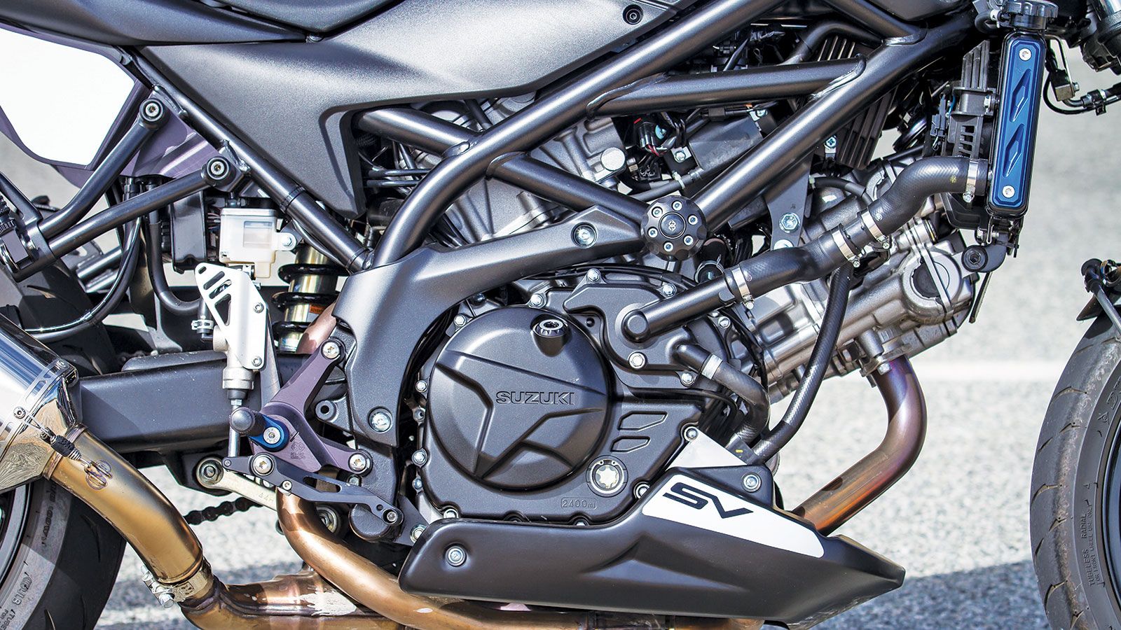 Ο κινητήρας που κινεί το SV είναι ο γνωστός δικύλινδρος V χωρητικότητας 645 κ.εκ. Αποδίδει γραμμικά 75 ίππους στις 8.500 σ.α.λ και 6,5 κιλά ροπής στις 8.100 σ.α.λ  μέσω ψεκασμού με σώματα 39 χιλ και μπεκ 10 οπών για καλύτερη διασπορά του καυσίμου στο θάλαμο, καλύπτοντας και τις Euro 4 προδιαγραφές. Η γραμμική του απόδοση δεν καθιστά αναγκαία τη χρήση traction control και έτσι από ηλεκτρονικά βοηθήματα συναντάμε μόνο το Low rpm Assist, το οποίο αναλαμβάνει να ανεβάσει ελαφρώς τις στροφές του κινητήρα την ώρα που αφήνουμε το συμπλέκτη, κάνοντας ευκολότερες τις εκκινήσεις. Όσον αφορά τις παρεμβάσεις που δέχτηκε το συγκεκριμένο μοντέλο από την αντιπροσωπία της Suzuki στον τομέα του κινητήρα, έχουν να κάνουν μόνο με την εξαγωγή και την προσθήκη ενός όμορφου τελικού της Yoshimura, με λεπτομέρειες από ανθρακονήματα και διακριτικό ήχο.