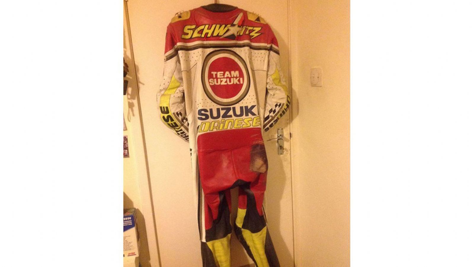 Ο πωλητής ισχυρίζεται ότι η φόρμα είναι αυθεντική και έχει φορεθεί στο Βρετανικό GP το 1993 από τον Kevin Schwantz, όταν αυτός έτρεχε για τη Lucky Strike Suzuki. Μάλιστα έχει σημάδια από το πέσιμο του Schwantz στο Donington Park κατά τη διάρκεια εκείνου του αγώνα.
