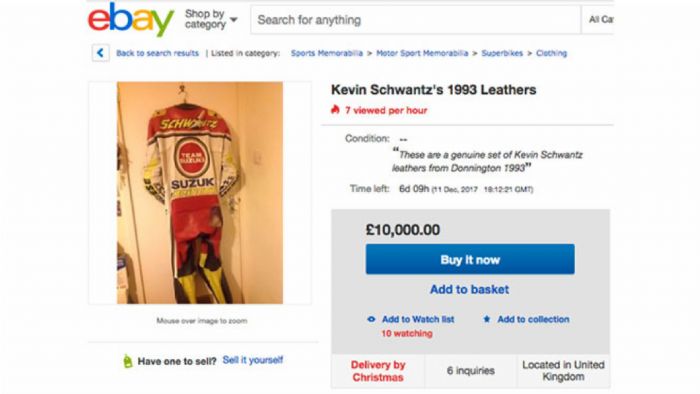 Σε αγγελία στο eBay έχει εμφανιστεί μια δερμάτινη φόρμα του Kevin Schwantz, η οποία πωλείται για 11.300 ευρώ.
