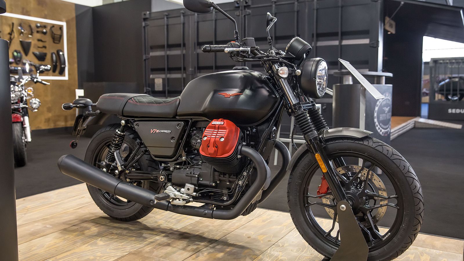Η εξολοκλήρου μαύρη ματ απόχρωση της V7 IIICarbon ενισχύεται από την αντίθεση λεπτομερειών σε κόκκινο χρώμα, που επιλέχθηκε για τη δαγκάνα Brembo του μπροστινού δισκόφρενου, τα λογότυπα στα πλαϊνά φέρινγκ και το σήμα του αετού στο ρεζερβουάρ καυσίμου. Ο κινητήρας ξεχωρίζει επίσης χάρη στα καπάκια των κυλινδροκεφαλών σε κόκκινο χρώμα με σατινέ φινίρισμα. Η σέλα (αποκλειστική για τη συγκεκριμένη έκδοση) διαθέτει αδιάβροχη επένδυση Alcantara, ιδιαίτερα ανθεκτική στις καιρικές συνθήκες και φινίρισμα με κόκκινη ραφή. Πράγματι, αυτό το μοντέλο διαθέτει πληθώρα εκλεπτυσμένων λεπτομερειών: τάπα ρεζερβουάρ από ανοδιωμένο μαύρο billet αλουμίνιο, μαύρο πλαίσιο προβολέα, όπως είναι και τα καλύμματα των μπεκ και το κάλυμμα της αντλίας του πίσω φρένου.