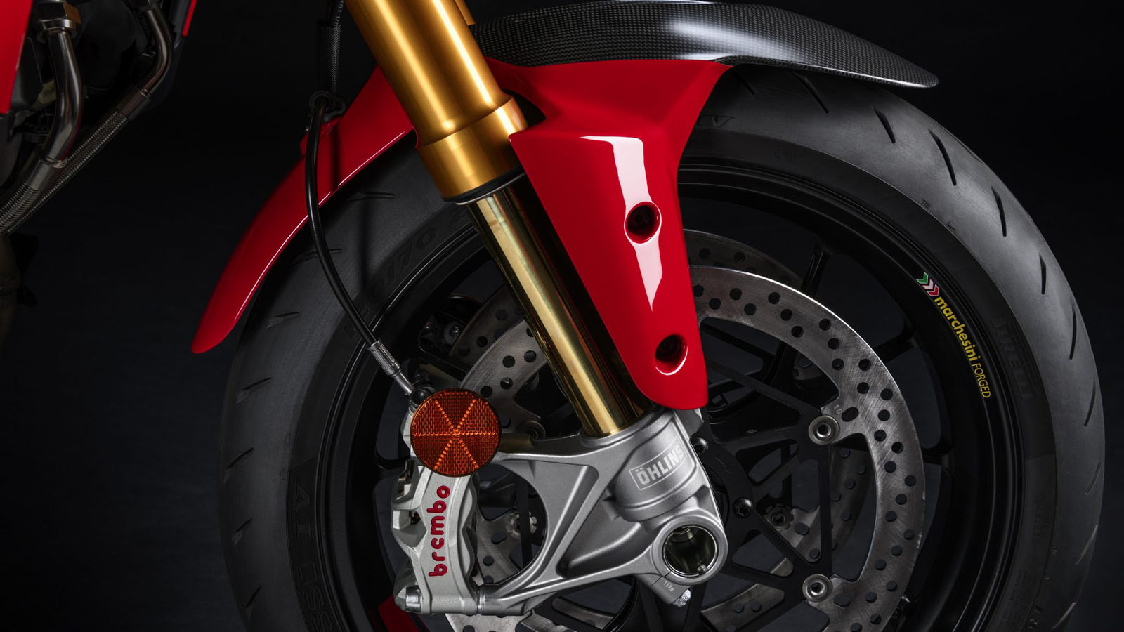 Το εξοπλιστικό επίπεδο της Multistrada V4 Pikes Peak πραγματικά εντυπωσιάζει, αφού το μοντέλο φέρει σφυρήλατους τροχούς αλουμινίου από την Marchesini, που είναι ελαφρύτεροι κατά 2,7 κιλά από αυτούς της Multistrada V4 S. Επιπρόσθετα, η ανάρτηση είναι Ohlins Smart EC 2.0, ηλεκτρονικά και αυτόματα ρυθμιζόμενη στις συνθήκες της διαδρομής. Το μοντέλο φέρει και γεωμετρικές αλλαγές:
