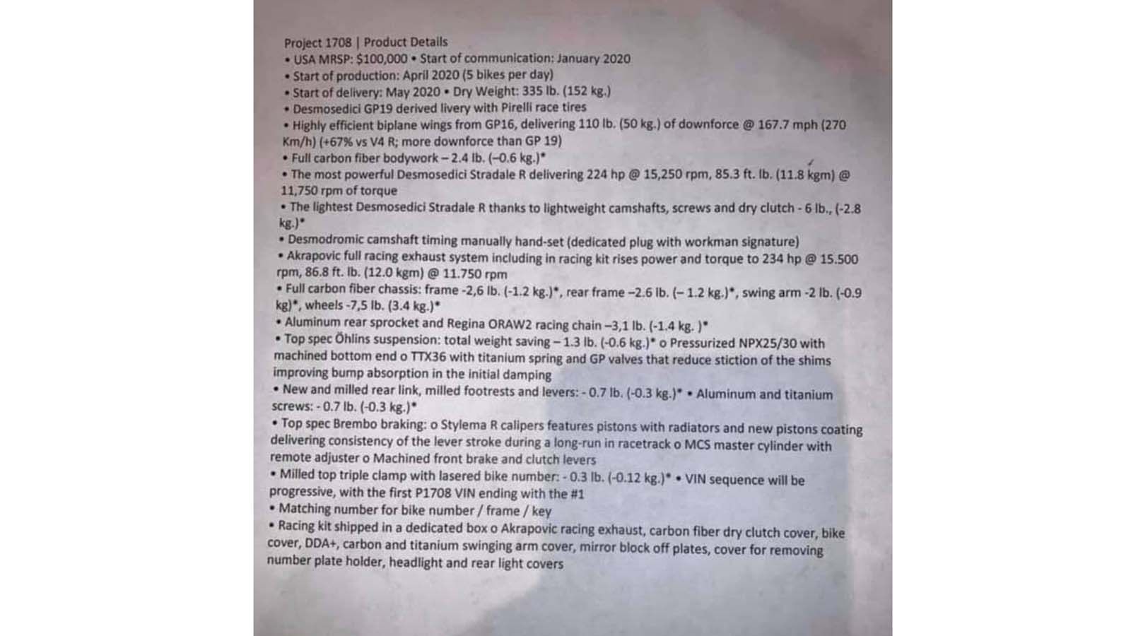 Αρχικά, η μοτοσυκλέτα θα ονομάζεται «Project 1708» και θα είναι η ισχυρότερη και ελαφρύτερη, αλλά μακράν και η πιο… απρόσιτη Panigale V4. Τα μπόλικα στοιχεία που δημοσιεύθηκαν, κάνουν λόγο για 224 ίππους, που θα φτάνουν τους 234 με την χρήση της αγωνιστικής εξάτμισης από την Akrapovic. Ο κινητήρας θα είναι ο «ελαφρύτερος Desmosedici Stradale R» και θα φέρει νέους εκκεντροφόρους, βίδες και συμπλέκτη χάνοντας 2,8 κιλά, ενώ ο χρονισμός του δεσμοδρομικού συστήματος των βαλβίδων θα έχει γίνει στο χέρι σε κάθε μοτοσυκλέτα - μάλιστα, το αντίστοιχο καπάκι θα φέρει την υπογραφή του μηχανικού που το ρύθμισε!