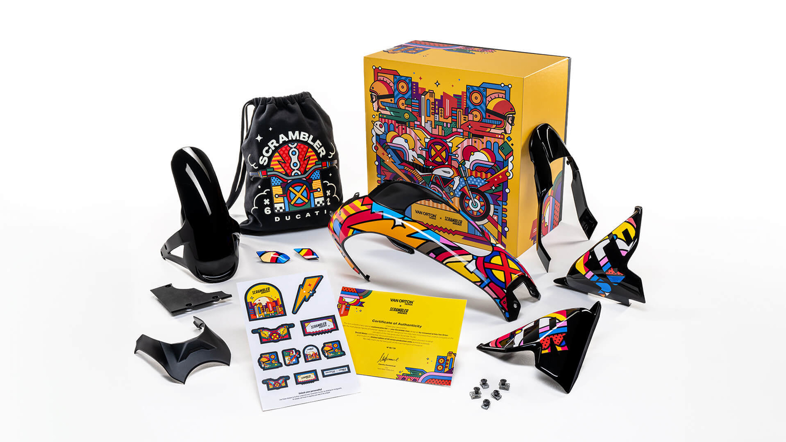 Η Ducati παρουσίασε ένα κιτ για το νέο Scrambler το οποίο έχει σχεδιάσει ο ιταλός ψηφιακός σχεδιαστής, VanOrton και θα παραχθεί σε 50 μόλις μονάδες. Η εταιρεία το περιγράφει ως: "Το πρώτο από μία συλλογή αποκλειστικών κιτ εναλλάξιμου κουστουμιού" εννοώντας πως θα ακολουθήσουν καιάλλα στο μέλλον. Το συγκεκριμένο, τοποθετεί ένα κάλυμμα που εφαρμόζει στο ρεζερβουάρ με τα νέα γραφικά.