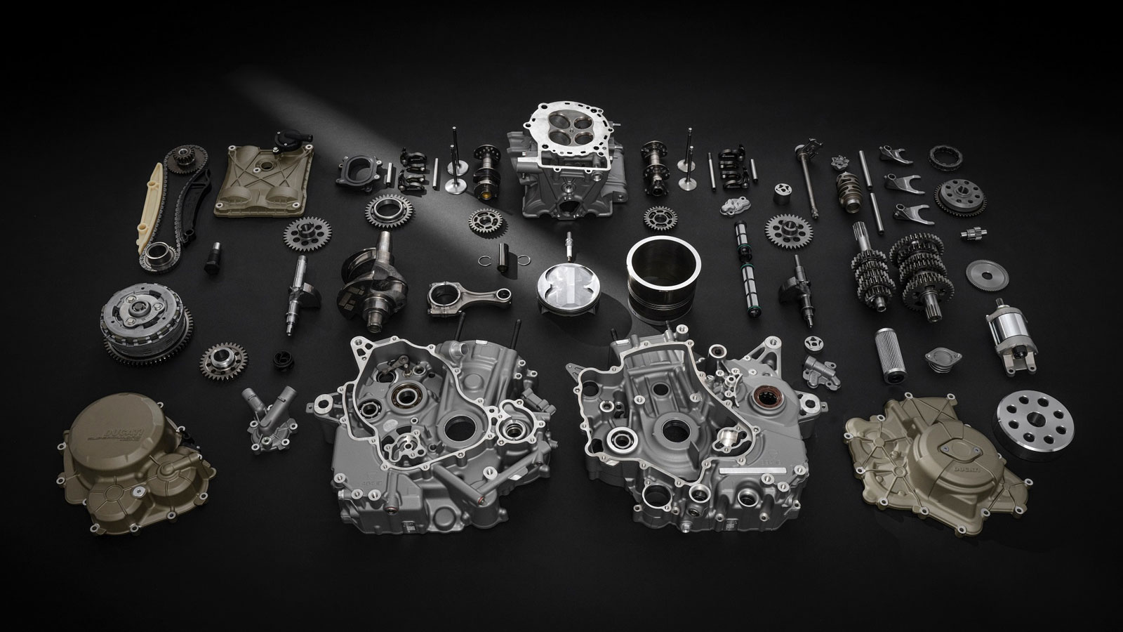 Οι χυτοί στροφαλοθάλαμοι του κινητήρα ενσωματώνουν το χιτώνιο νερού γύρω από το σώμα του κυλίνδρου, κατασκευασμένο όπως και στη 1299 Superleggera από αλουμίνιο και όχι χάλυβα, με πλεονεκτήματα όσον αφορά το βάρος και την ψύξη λόγω της λεπτότητας των τοιχωμάτων. Αυτή η λύση επιτρέπει επίσης τη στερέωση της κεφαλής απευθείας στον στροφαλοθάλαμο, συμβάλλοντας σε έναν πολύ πιο συμπαγή κινητήρα με την ίδια δομική ακαμψία. Ο συμπλέκτης, ο εναλλάκτης και τα καλύμματα κεφαλής κατασκευάζονται με χύτευση κράματος μαγνησίου, και πάλι για μείωση του βάρους του κινητήρα στο ελάχιστο, με παράλληλη εγγύηση υψηλής μηχανικής αντίστασης.