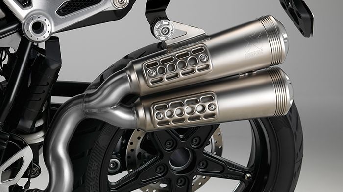 Όσον αφορά στις εξατμίσεις, να σημειώσουμε πως ο συνδετικός σωλήνας ππου οδηγεί από τον καταλύτη (κάτω από τον κινητήρα) προς τα πάνω είναι ένα εξάρτημα που υπήρχε ήδη ως κωδικός στην Akrapovic για όσους θέλουν να χρησιμοποιήσουν το έξτρα μονό τελικό της Σλοβένικης εταιρείας για το βασικό R NineT σε μια θέση ψηλά στην ουρά, σε στυλ scrambler.