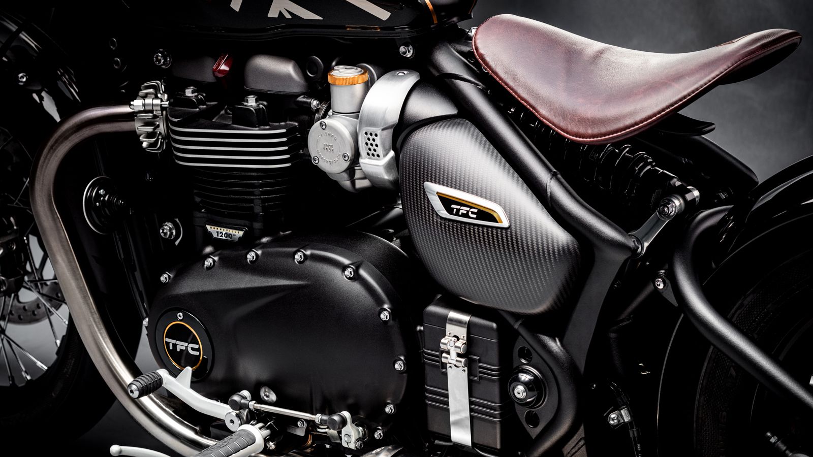 Η Bobber TFC ανεβάζει τον πήχη ακόμη πιο ψηλά, με υπερπολυτελή φινιρίσματα και λεπτομέρειες, υψηλότερης απόδοσης και ροπής κινητήρα 1200 κ.εκ., ελαφρύτερο πλαίσιο υψηλών προδιαγραφών και κορυφαίου επιπέδου εξοπλισμό και τεχνολογία Triumph Factory Custom (TFC).