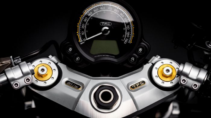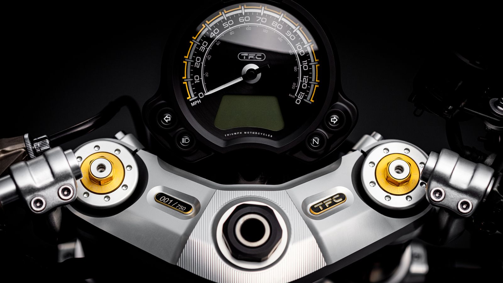 Όλα αυτά συνδυάζονται με μια ολόκληρη σειρά από όμορφα κατάμαυρα χαρακτηριστικά. Στο ρεζερβουάρ περιλαμβάνεται επίσης, χρυσαφί λωρίδα, ενώ αποκλειστικές χρυσαφί λεπτομέρειες έχουν εφαρμοστεί σε ολόκληρη τη μοτοσυκλέτα, από τα σήματα και τις προσόψεις των οργάνων μέχρι και το μοναδικό κλειδί. Ολόκληρος ο φωτισμός είναι τύπου LED για καλύτερη ορατότητα, ενώ τα νέα στιλάτα όργανα διαθέτουν λογότυπο TFC και διακοσμητικό με νέο λογότυπο Triumph