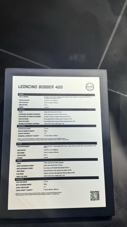 Η Benelli παρουσίασε το νέο Leoncino Bobber 400 στην Διεθνή Έκθεση της EICMA, μία μοτοσυκλέτα που παντρεύει το μοντέρνο και το κλασικό, φέρνοντας τον Bobber σχεδιασμό στο σήμερα. To σχεδιαστικό τμήμα της εταιρείας από το Pesaro έχει "πασπαλίσει" το μοντέλο με φουτουριστικά στοιχεία όπως τον τετραγωνισμένο προβολέα εμπρός. Το ρεζερβουάρ 15 λίτρων με τις χαρακτηριστικές γραμμές της οικογένειας Leoncino, δίνει στο μοντέλο ένα επιθετικό προφίλ, ενώ η Benelli θέλοντας να διατηρήσει αυθεντικά Bobber στοιχεία στην μοτοσυκλέτα, αφήνει ένα μικρό κενό ανάμεσα σε αυτό και την σέλα. Η κοφτή αλουμινένια ουρά, τα ελαστικά με το ψηλό προφίλ και οι καθρέπτες που τοποθετούνται στις απολήξεις του τιμονιού δίνουν στο μοντέλο μία μυώδη εμφάνιση, που θα λέγαμε ότι πλησιάζει στην εμφάνιση ενός Power Cruiser.