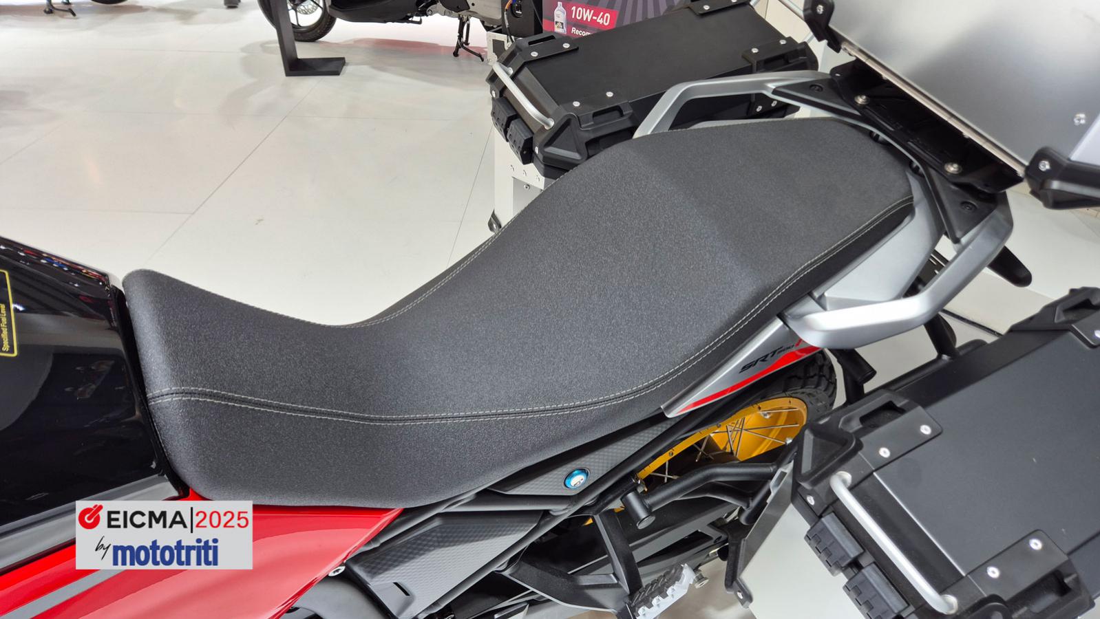 Η SRT 450 RX βασίζεται σε γερά adventure θεμέλια. Το μεταξόνιο των 1.525 mm και η απόσταση από το έδαφος των 210 mm την καθιστούν ικανή να κινηθεί σε μονοπάτια και σπαστές επιφάνειες, ενώ η ύψος σέλας 835 mm προσφέρει καλή ισορροπία ανάμεσα στην άνεση και τον έλεγχο. Οι τροχοί 21 ιντσών εμπρός και 18 πίσω με ελαστικά 90/90-21 και 140/70-18 προσφέρουν κορυφαία πρόσφυση σε κάθε τερέν, ενώ οι αναρτήσεις μεγάλων διαδρομών και η προστατευτική ποδιά κινητήρα ενισχύουν τον περιπετειώδη χαρακτήρα. Στο περίπτερο του Μιλάνου, η 450 RX παρουσιαζόταν με αλουμινένιες πλαϊνές βαλίτσες τριών θέσεων, δείχνοντας έτοιμη για πραγματικό ταξίδι.