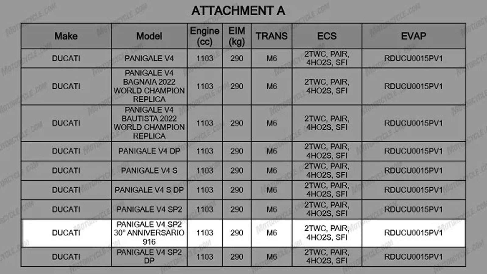 Τα έγγραφα από την υπηρεσία έγκρισης ρύπων της Καλιφόρνια, κατηγοριοποιούν την νέα επετειακή μοτοσυκλέτα μαζί με τις Panigale V4 του 2024, κάτι που σημαίνει ότι και αυτή θα φέρει τον ίδιο κινητήρα των 1.103cc.