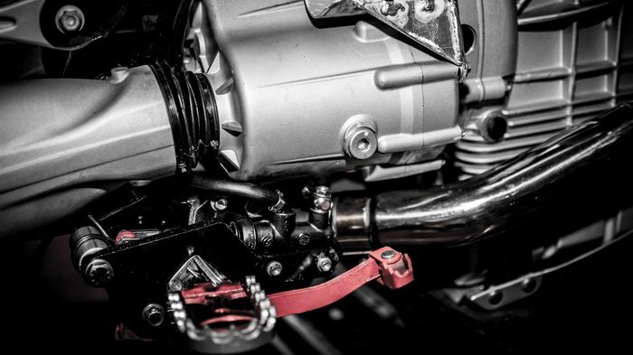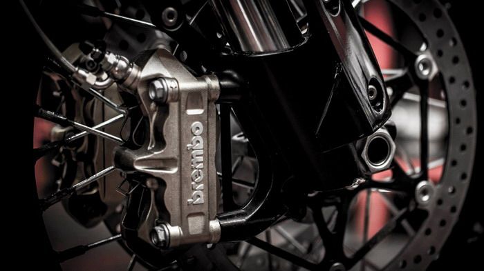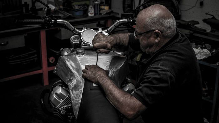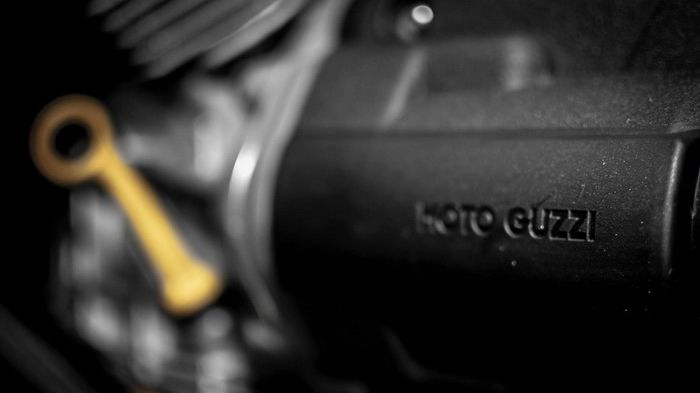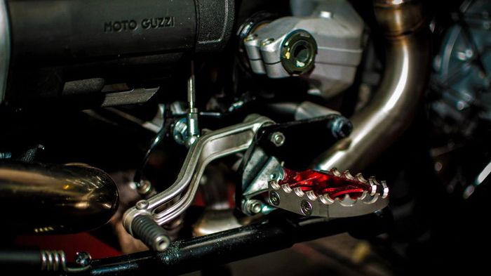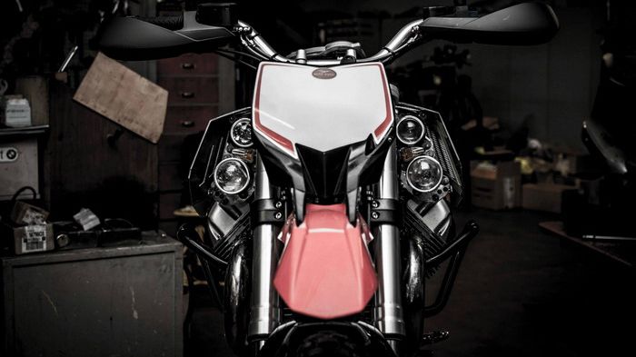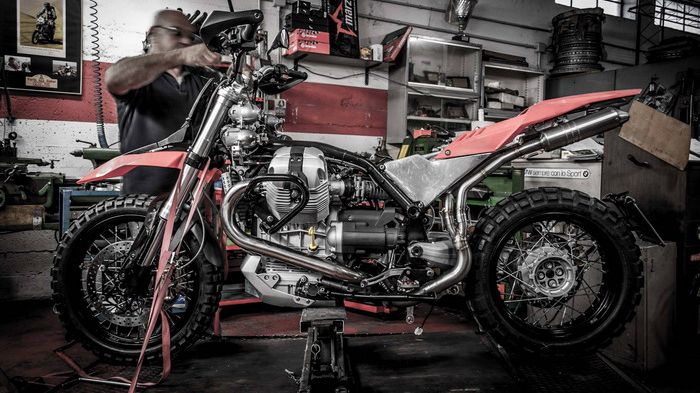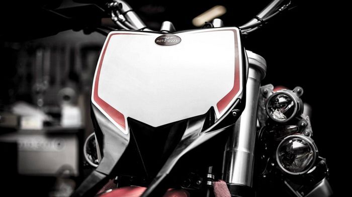 Πέταξε τους προβολείς, έβαλε μπροστινό φτερό MX από Aprilia MXV, αλλά με logo Moto Guzzi, έφτιαξε το δικό του ρεζερβουάρ, ταίριαξε 4 μικρά προβολάκια στο κτήνος, έβαλε διαφορετικά κάγκελα στο μοτέρ, άλλο υποπλαίσιο... και τι δεν έκανε! Ακόμα και ο κινητήρας δείχνει μυστήριος, αφού οι κεφαλές δεν είναι του Stelvio, αλλά μάλλον προέρχονται από... Breva, καθώς διαθέτουν την χαρακτηριστική μαύρη ρίγα στη μέση. Το μπροστινό ανάποδο πιρούνι θυμίζει εκείνο του Stelvio, όμως οι δαγκάνες των φρένων είναι διαφορετικές, μάλλον monoblock, από άλλη μοτοσικλέτα.