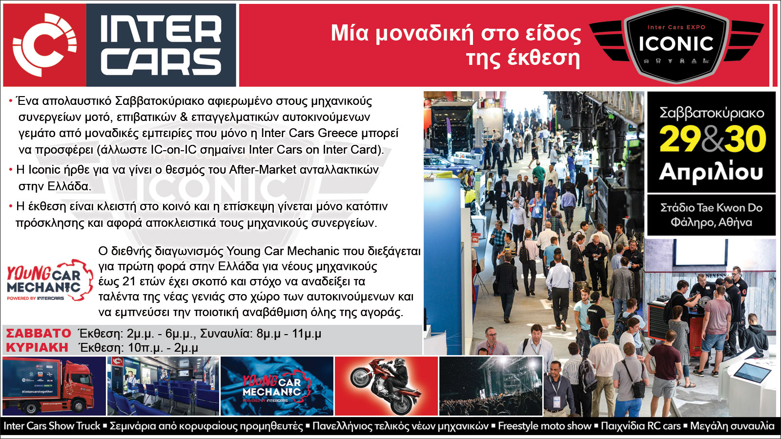 Η γνωστή εταιρία ΙΝΤΕR CARS με πρωταγωνιστική παρουσία σε 30 χώρες στο χώρο των ανταλλακτικών αυτοκινήτου, μοτοσυκλέτας και γενικά ότι κινείται οργανώνει μεγάλη έκθεση το τελευταίο Σαββατοκύριακο του Απριλίου στο Παλαιό Φάληρο, στις εγκαταστάσεις του Τae Kwon Do.