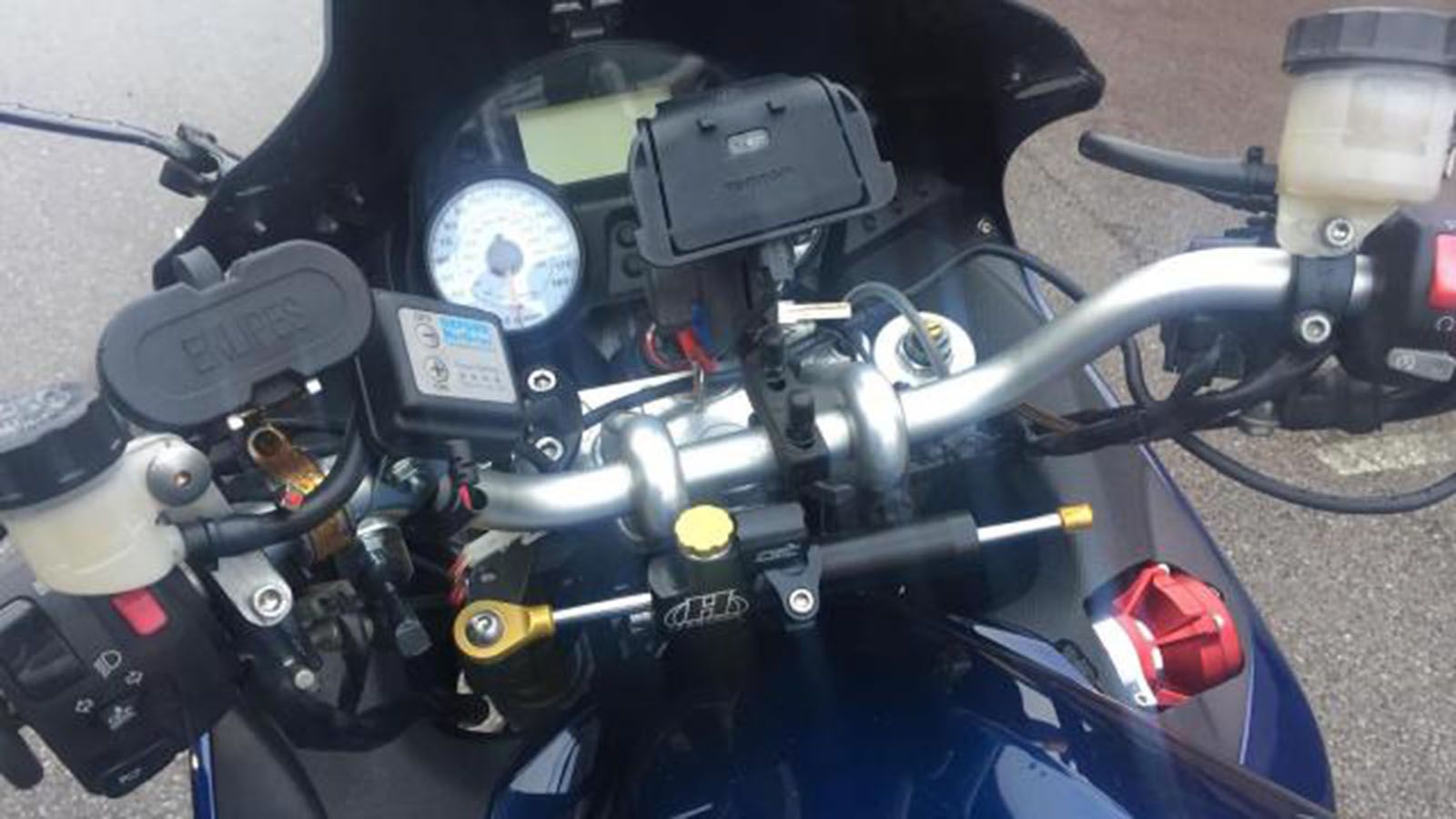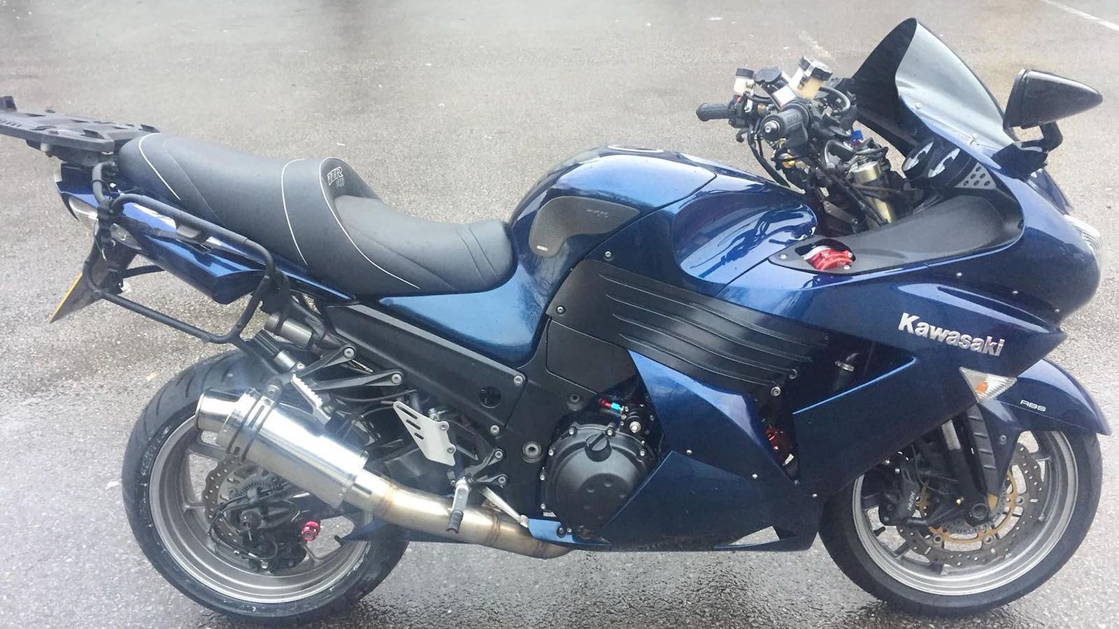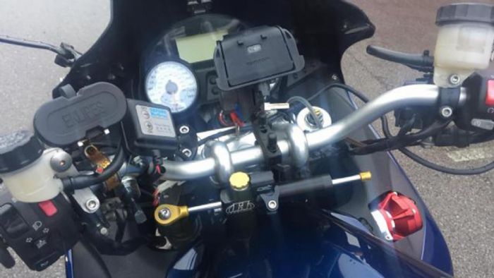 Προσέξτε αυτή την ZZR1400. Οι αλλαγές που έχουν γίνει πάνω της είναι πολύ μεγάλες, μάλιστα οι περιοσσότερες φαίνονται. Δείτε την σέλα, τις βάσεις για βαλίτσες πίσω και τις… θεότρελες προσθήκες στο τιμόνι! Πέρα από τα θερμαινόμενα γκριπ, την βάση για σύστημα πλοήγησης, τη φουσκωμένη ζελατίνα αλλά και το ίδιο το τιμόνι, η μοτοσυκλέτα έχει και έναν διπλό… αναπτήρα για πούρα, στο αριστερό μέρος του τιμονιού!