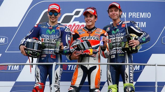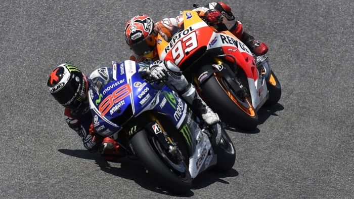 Στην «πρώτη γραμμή» ο Marquez κυνηγούσε υπομονετικά τον Lorenzo, κλείνοντας σταδιακά την διαφορά τους, ψάχνοντας μια ευκαιρία για να προσπεράσει. Κοντά στα μέσα του αγώνα ο Lorenzo έκανε ένα λάθος πάνω στη στροφή επιτρέποντας στον Marquez να πλησιάσει την πίσω ρόδα της Yamaha και, από κει και πέρα, οι δυο πρωταθλητές ολοκλήρωναν τους υπολοιπόμενους γύρους σχεδόν ο ένας πάνω στον άλλον! Οκτώ γύρους πριν το τέλος ο Marquez κατάφερε να οδηγεί στην πρώτη θέση προσπερνώντας τον Lorenzo στην είσοδο της πρώτης στροφής, κάτι που δεν κράτησε και πολύ αφού μετά από μερικούς γύρους ο Lorenzo απάντησε με νέα προσπέραση.