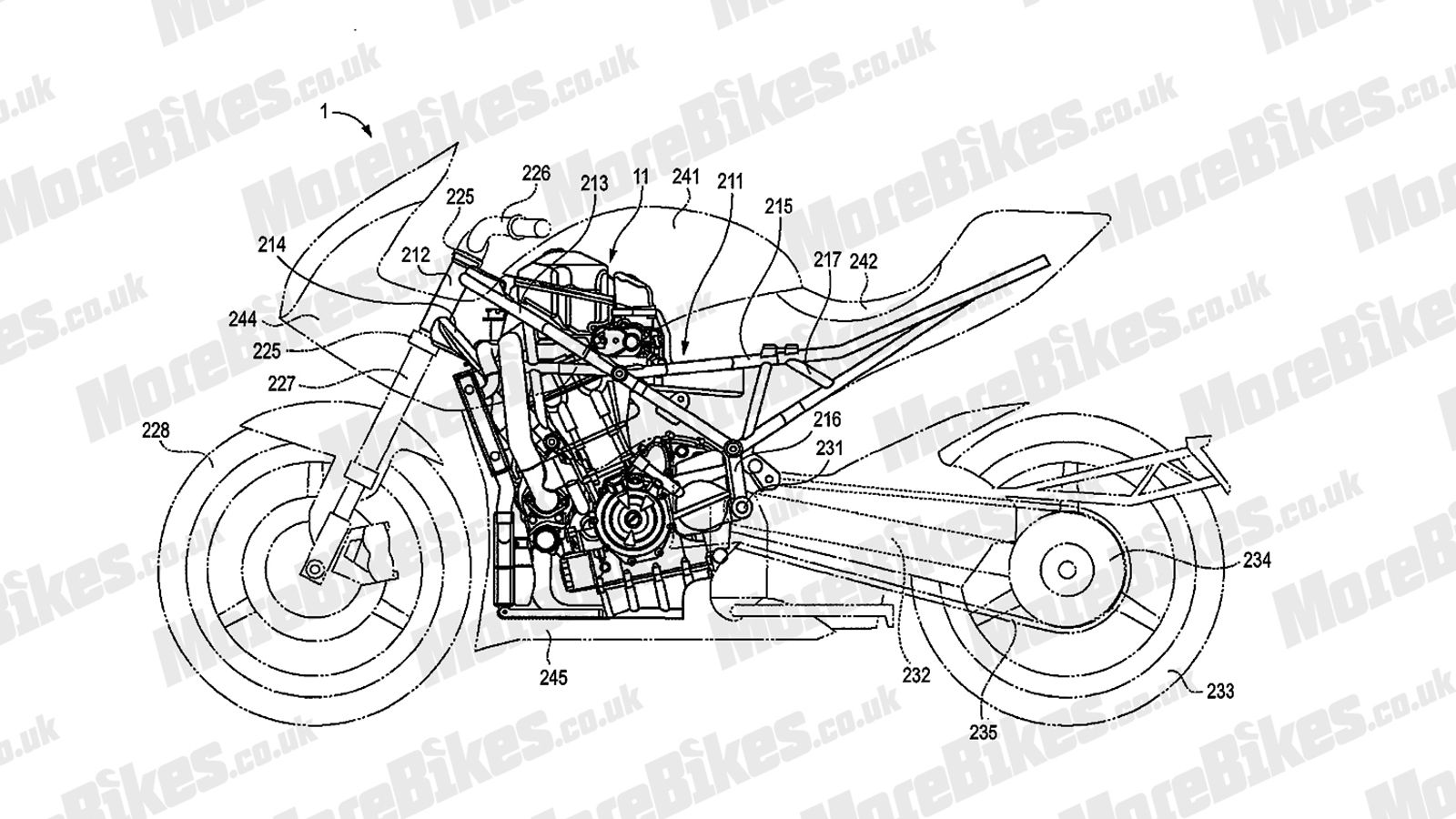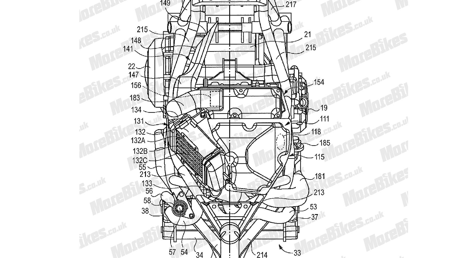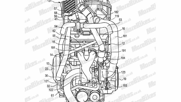Προσέξτε την χαρακτηριστική μορφή ενός turbo, που διακρίνεται στο εμπρός μέρος του κινητήρα: Βλέπουμε τους δύο αυλούς να μπαίνουν σε μία φτερωτή, έναν ακόμα να βγαίνει από την διπλανή φτερωτή και να ανεβαίνει σε ένα intercooler, το οποίο μάλλον θα τοποθετηθεί ψηλά και πλευρικά στην μοτοσυκλέτα. Από ότι φαίνεται, επίσης, το Intercooler είναι «κολλημένο» στο φιλτροκούτι, μειώνοντας το μήκος των αυλών του αέρα.