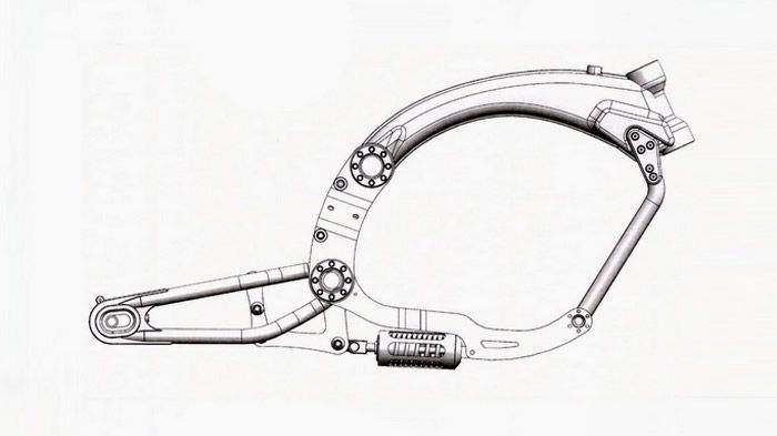 Το πλαίσιο της μοτοσικλέτας με το αμορτισέρ τοποθετημένο οριζόντια κάτω από το αυτό.