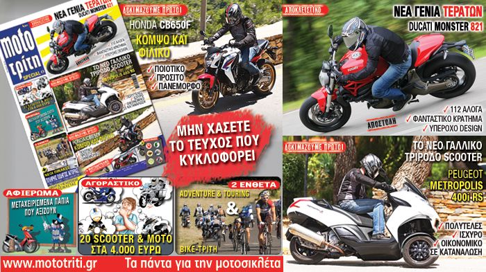 Το νέο τεύχος του Moto Τρίτη μας ταξιδεύει σε σημεία και… τέρατα, με το νέο Ducati Monster 821, καθόμαστε πρώτοι στην σέλα του τρίροδου scooter Peugeot Metropolis 400i RS, ενώ πρώτοι πάλι δοκιμάζουμε το νέο Honda CB650F.
