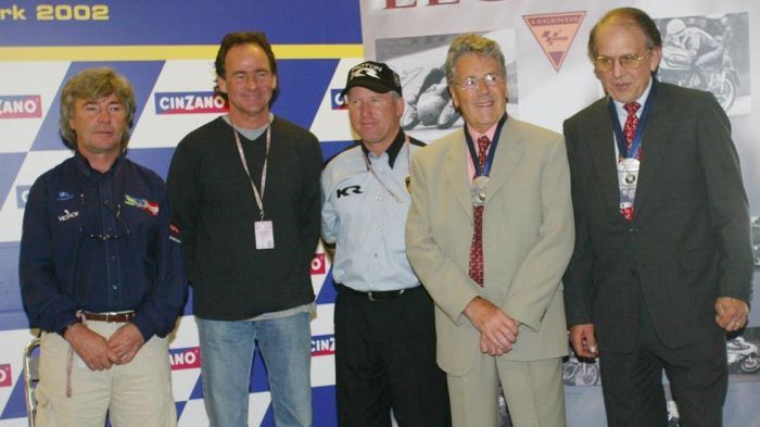 Βράβευση θρύλων από τη FIM στο Αγγλικό GP του 2002. Από αριστερά: Angel Nieto, Alberto Puig, Kenny Roberts, Geoff Duke, Phil Read.