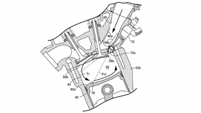 Στο εσωτερικό ενός κυλίνδρου του νέου κινητήρα: Φαίνεται η χρήση μπεκ άμεσου ψεκασμού, στο πίσω μέρος, κοντά στην βαλβίδα εισαγωγής.