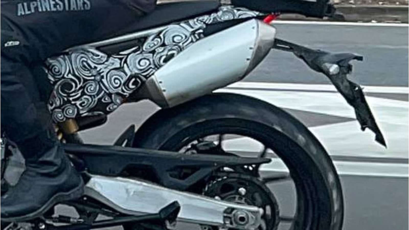 Στις φωτογραφίες βλέπουμε ανεστραμμένο πιρούνι μπροστά και μονοσόκ αμορτισέρ πίσω, ενώ οι αλουμινένιες ζάντες είναι 17” και στο μονό δισκόφρενο μπροστά βλέπουμε μια δαγκάνα Brembo.