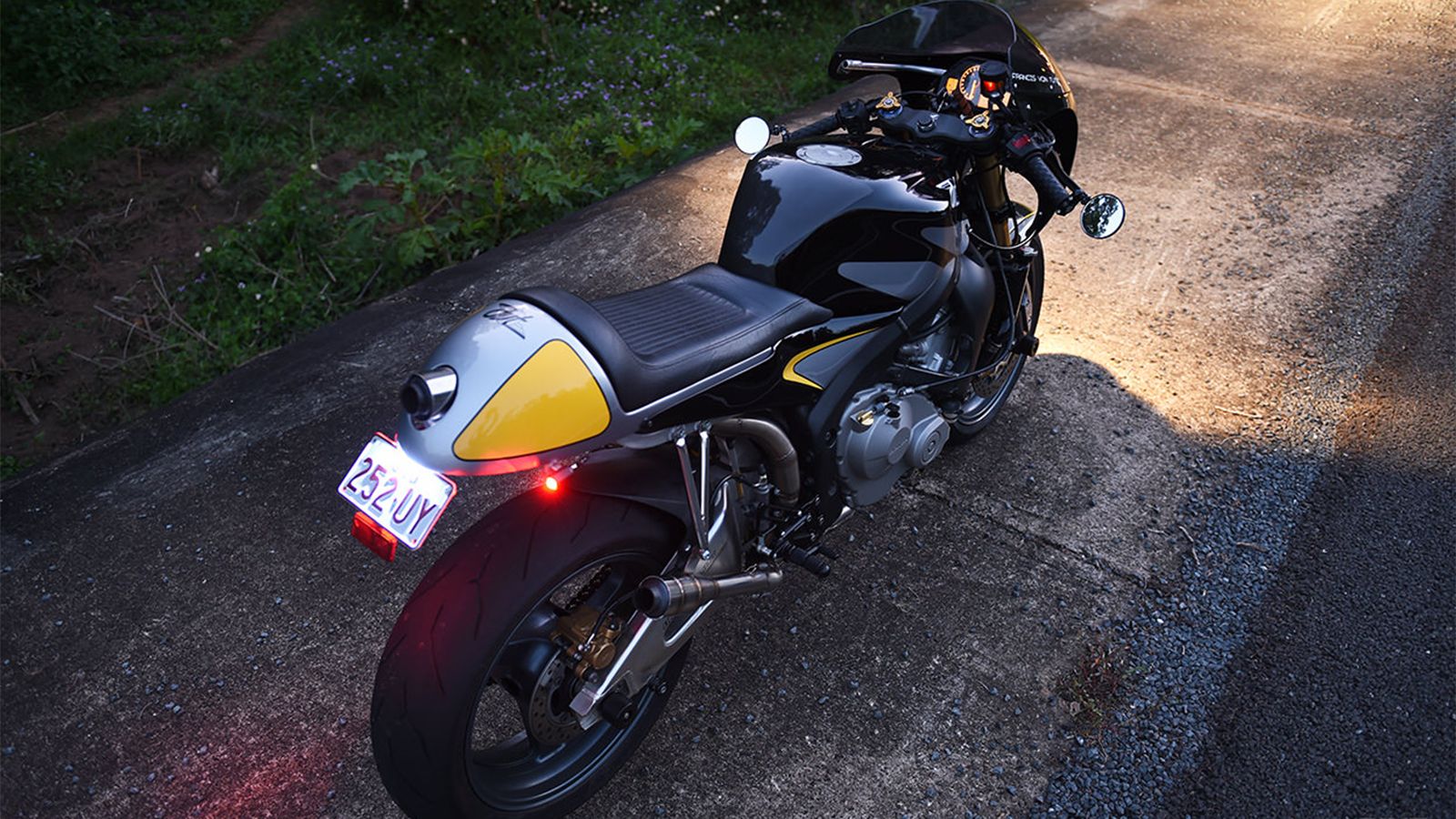Η μοτοσυκλέτα διατήρησε το εργοστασιακό ρεζερβουάρ, ωστόσο η ουρά κατασκευάστηκε στο χέρι, το εμπρός φτερό προήλθε από μια 600RR του 2010 και η σέλα φτιάχτηκε από τον μηδέν από τον David Webster. Ρυθμιζόμενα μαρσπιέ αναβάτη και ελαστικά Diablo Rosso Corsa από την Pirelli, προσθέτουν κι άλλες αγωνιστικές πινελιές. Τέλος, το μαύρο και κίτρινο στα χρώματα αποτελούν φόρο τιμής, στο motorsport της δεκαετίας του 80. Πως σας φαίνεται;