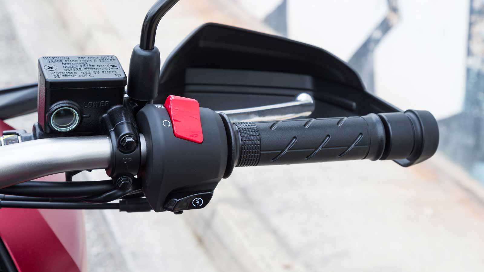 Η διαχείριση όλων των ρυθμίσεων της οθόνης και η απ-ενεργοποίηση του traction, ελέγχονται από τους αντίστοιχους διακόπτες στο αριστερό μέρος του τιμονιού. Στα δεξιά βρίσκεται η μίζα εκκίνησης και το killswitch.