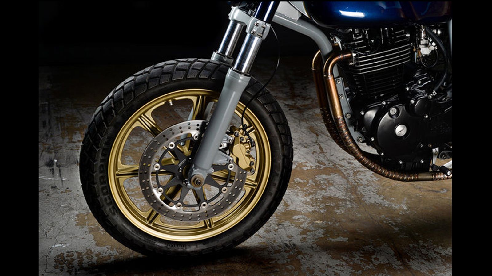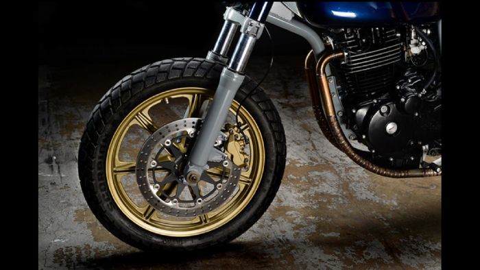 Το πιρούνι είναι κληρονομιά από ένα Suzuki GSX-R, ενώ το σύστημα πέδησης έχει ανανεωθεί με ένα μεγάλο δίσκο που ακινητοποιείται από μια δαγκάνα δύο εμβόλων. Το ψαλίδι είναι ευγενική χορηγία από ένα SV-650 και οι ζάντες αλουμινίου των 18 ιντσών προέρχονται από ένα Yamaha RD400.