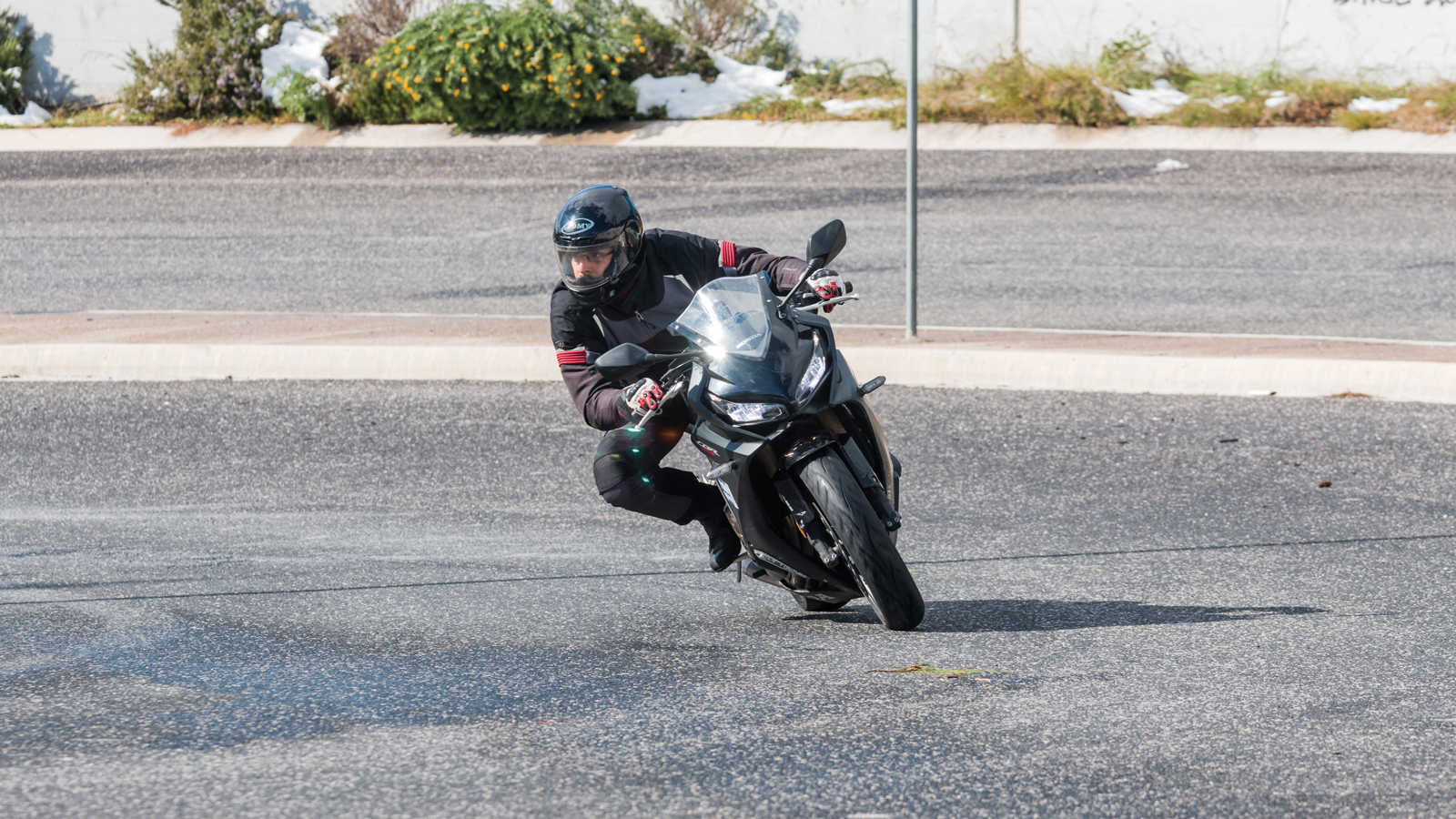 Η γεωμετρία ευνοεί την οδηγική σταθερότητα και αυτό γίνεται αισθητό με υψηλά επίπεδα πρόσφυσης και πολύ καλή ποιότητα κύλισης. Τα ανοικτά κλιπ-ον δημιουργούν τον απαραίτητο μοχλισμό, ώστε το CBR να αποκρίνεται στις εντολές του αναβάτη όπως πρέπει στο εντός πόλης περιβάλλον. Μιλάμε για ένα άκαμπτο σύνολο που αλλάζει κατεύθυνση με ακρίβεια και στιβαρότητα επιτρέποντας έντονους ή ενίοτε και επιθετικούς χειρισμούς, χωρίς να παρουσιάσει ταλαντώσεις. Έτσι, ο έμπειρος αναβάτης απολαμβάνει μια μοτοσυκλέτα που βρίσκεται 100% στον έλεγχο του, ενώ κάποιος πιο αρχάριος αποφεύγει «λαχτάρες» από νευρικότητα και πολύ γρήγορες εναλλαγές. Σε πόλεις όπως οι δικές μας, οι αναρτήσεις πρέπει να δουλεύουν άψογα και για το CBR αυτό ισχύει: Πιρούνι και αμορτισέρ έχουν μαλακές ρυθμίσεις, που απορροφούν ικανοποιητικά τις κακοτεχνίες κατά την καθημερινή οδήγηση. Στην πέδηση, φυσικά την περισσότερη δουλειά κάνουν οι δύο εμπρός δίσκοι, με άριστη προοδευτικότητα ισχύος και πολλή δύναμη αν την ζητήσετε. Ο πίσω δίσκος συμπληρώνει την πέδηση με όση ισχύ χρειάζεται, ενώ το ABS λειτουργεί τάχιστα κατά την εμπλοκή του χωρίς να μεταδίδει έντονες δονήσεις σε μανέτα και πεντάλ. Η αποτελεσματικότητα του συστήματος υπογραμμίζεται από την πολύ καλή επίδοση των 42,4 μέτρων για την ακινητοποίηση από τα 100 χλμ/ώρα.