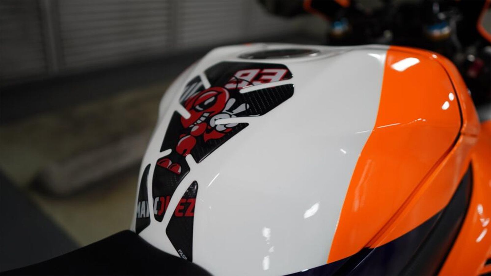Αυτή η CBR1000RR-R SP που βλέπετε εδώ μετουσιώθηκε σε Repsol replica, από τον ιδιοκτήτη της που ακούει στο όνομα Ikemen_0606, στο Twitter. Προφανώς θαυμαστής της Honda στα MotoGP, αλλά και του Marc Marquez, ο Ikemen κυριολεκτικά μεταμόρφωσε την CBR του σε RC213V, με απόλυτη προσοχή στην λεπτομέρεια. Τα χρώματα του πορτοκαλί, του λευκού και του σκούρου μπλε στολίζουν την CBR, οι ζάντες αστράφτουν στο έντονο πορτοκαλί, ενώ το σετ αυτοκόλλητων και χαλκομανιών είναι λεπτομερέστατο.