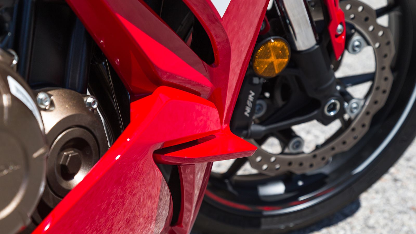 Ξεφεύγοντας ελαφρώς από την… δημοσιογραφική γλώσσα, η πρώτη λέξη που σου έρχεται στο μυαλό κοιτάζοντας το CBR500R είναι: «Μπάνικο». Νεανικός χαρακτηρισμός, που αποδίδεται σε κάτι που ξεχωρίζει και τραβάει την προσοχή, και το CBR500R το πετυχαίνει αβίαστα. Πιο «αιχμηρό» από ποτέ, εμπνευσμένο και από τα CBR650R και CBR 1000 Fireblade, το 500R κάνει αισθητή την παρουσία του. Μπροστά, εμφανίζεται επιβλητικό, ογκώδες και αιχμηρό όσο χρειάζεται ώστε να υποστηρίζει την supersport ταυτότητα του. Πίσω, η ουρά μικραίνει και έχει αεροδυναμικά ανοίγματα και σφηνοειδή απόληξη, με αποτέλεσμα η σχεδίαση της CBR 500R έχει αισθητό «οπτικό βάρος» στο εμπρόσθιο μέρος. Στην δεύτερη ματιά, ανακαλύπτεις δύο «πτερύγια» στο κάτω μέρος των πλευρικών fairing, που ταιριάζουν γάντι με τις εμφανισιακές επιταγές των εποχών. Η ζελατίνα είναι ιδιαίτερα κοντή και οι καθρέπτες είναι τοποθετημένοι στο εμπρόσθιο fairing. Το USD πιρούνι στο εμπρός μέρος, συνυπογράφει την εμφανισιακή ταυτότητα της μοτοσυκλέτας, που θυμίζει μοντέλο μεγαλύτερου κυβισμού, χάρη στην full-size διάπλαση της. Το εμπρός φανάρι, είναι ακόμα ένα στοιχείο που το μοντέλο μοιράζεται με το CBR650R, ενώ τα φλας είναι LED. Στα πρότυπα που μας έχει συνηθίσει η Big-H, το επίπεδο της ποιότητας κατασκευής είναι κορυφαίο, και για το CBR500R. Όντας το πλέον «ντυμένο» από τα μοντέλα της σειράς των CB500, η συναρμολόγηση και το φινίρισμα του CBR 500R δεν επιδέχονται κριτικής, όπως επίσης και η επιλογή των επιμέρους υλικών και το βάψιμο. Πρόκειται για μια μοτοσυκλέτα που φλερτάρει με επίπεδο ποιότητας ανώτερων κατηγοριών.